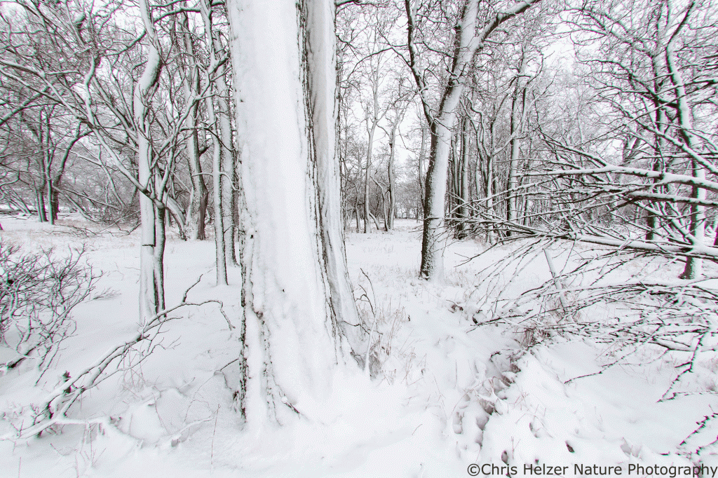 All was not lost – I did have a camera body (whew!) and two lenses: a fisheye lens and a long telephoto. That’s an odd combination of lenses, but since I’d driven more than half an hour in less-than-ideal road conditions, I wasn’t just going to pack it in and head home. I grabbed the fisheye lens and headed toward some trees near the river where the driven snow had created some aesthetically-pleasing lines.