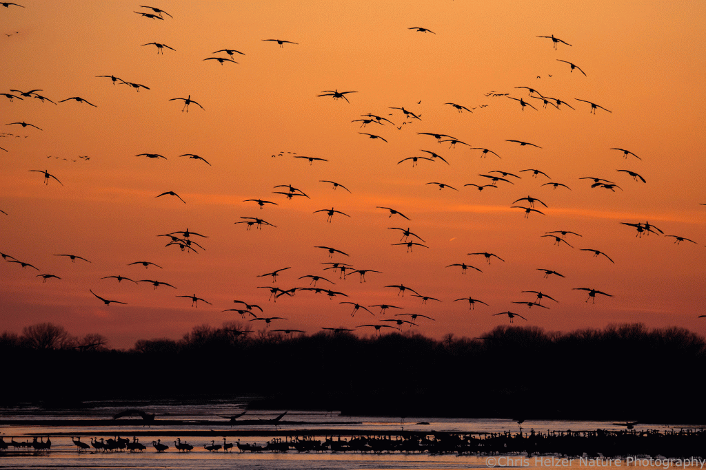 As the sun set, sandhill cranes started pouring in upstream of us, dropping out of the sky against a nice orange glow near the horizon. I didn’t have my tripod with me (limited space in the blind) and I had other responsibilities (tour guide) but I did manage to squeeze off a few photos of the cranes and crane viewers.