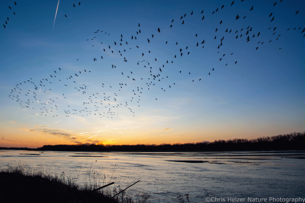 Tuesday night, I had the chance to take some supporters of The Nature Conservancy into a viewing blind to watch sandhill cranes come in to roost on the Platte River. We’re very fortunate to have a front row seat to the annual migration of sandhill cranes and their staging along the Central Platte River. Nearly 1,000,000 of them spend a good portion of March in the Platte Valley each year. It was a beautiful night, made even more spectacular by the seven whooping cranes waiting for us when we arrived at the blind. They were too far away for terrific photos, but it was really nice to see them!