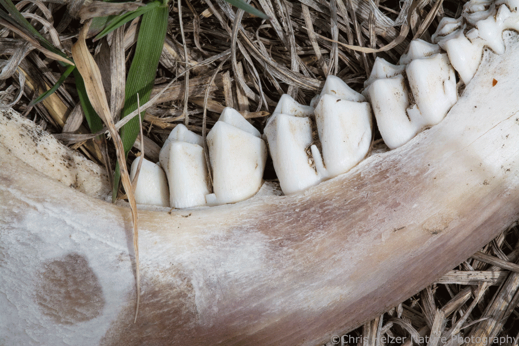 The most interesting thing I found was a deer carcass behind the dam of our old pond. It had been there long enough that it had been mostly stripped down to bones, but there was some hair left on the skull and legs. Before I found the full skeleton, I came across its lower jaw bones, which I stopped to photograph mainly because I needed something that wasn’t either blowing in the wind or flying away from me.