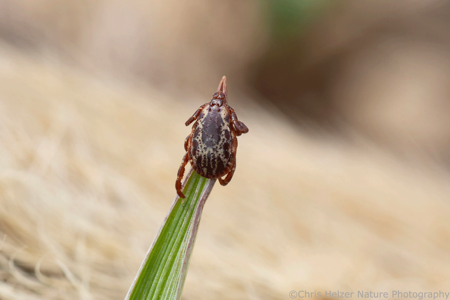 My curiosity was piqued further when I started noticing dog ticks (Dermacentor variabilis) in the grass around the carcass. When I saw the first one, I didn’t think much of it, other than to recognize it as another sign of the coming spring. After spotting the fourth one, though, I realized maybe there was something going on. A couple were on the carcass itself, but most were perched on plants within a foot or two of it. There were at least half a dozen. All but one of the ticks were males, but I’m not sure if that’s relevant.