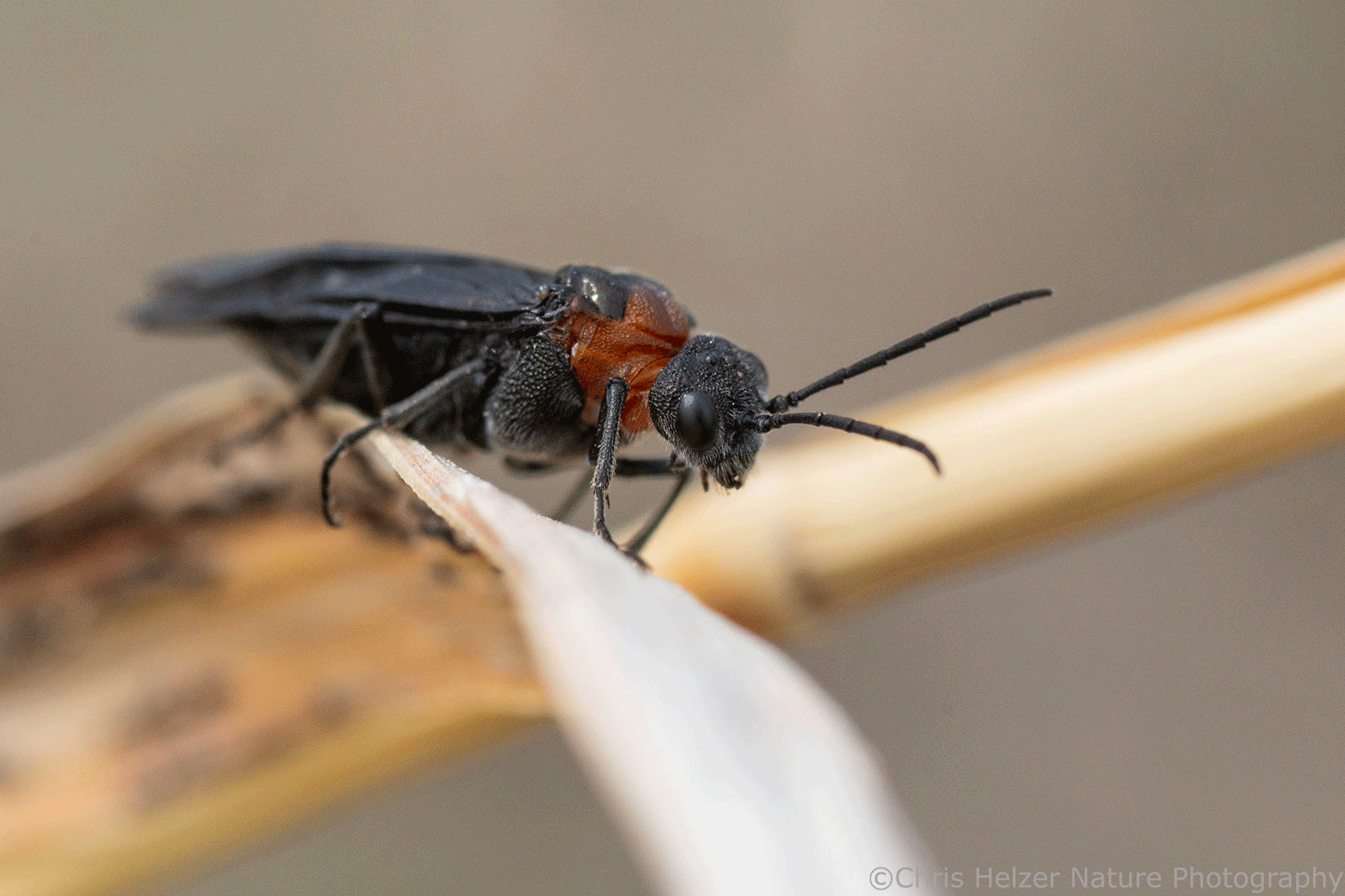 I did, eventually, manage to catch one sawfly sitting still long enough to get a decent photo of it. There was another one nearby that looked similar, but without any red on its thorax, which made me wonder if I was seeing two species or males and females of one species. Given the little I know about sawflies, I’m guessing maybe these had overwintered as pupae and had just emerged to mate. No wonder they didn’t want anything to do with me – they had much more important things on their minds!