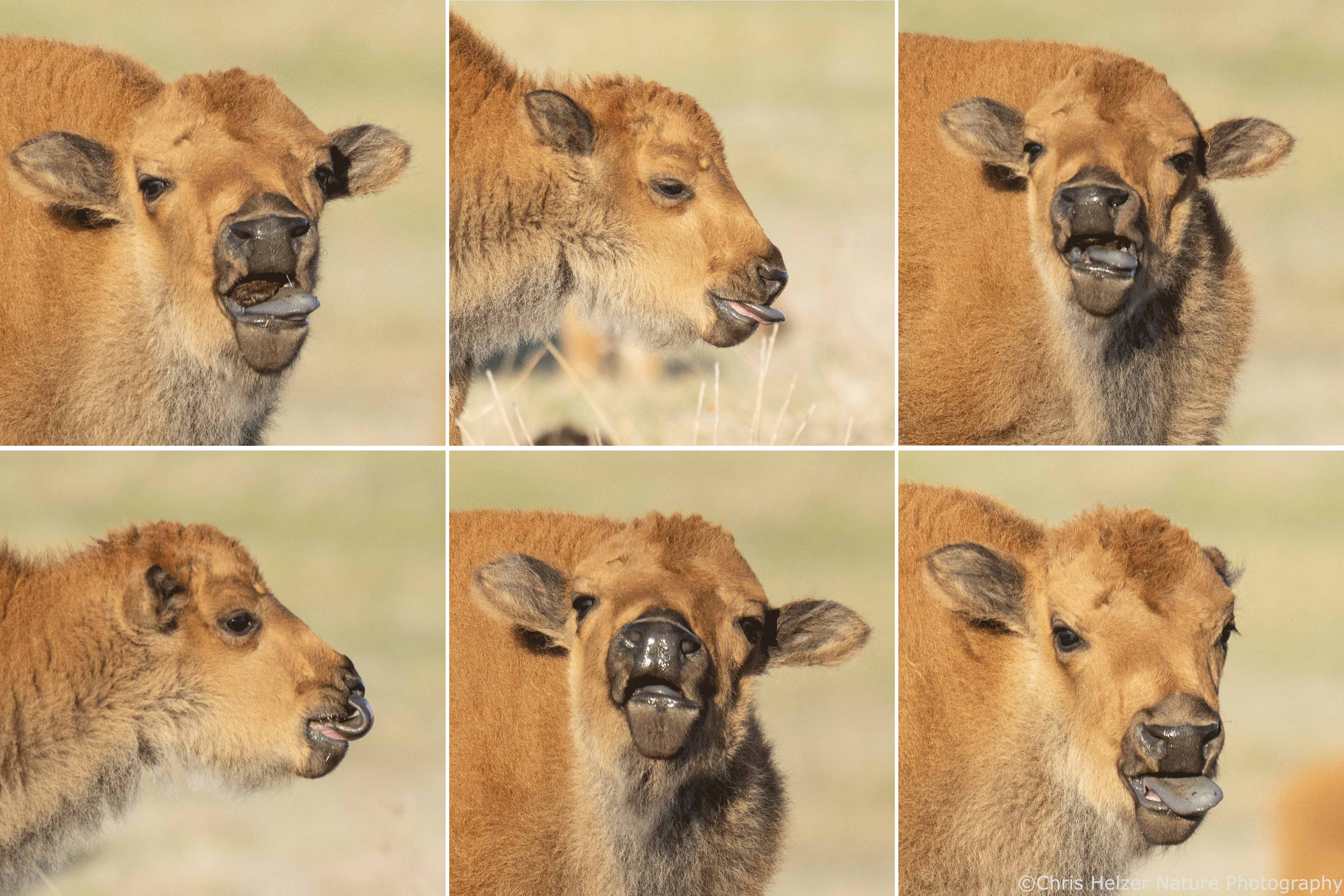 Now, bison calves are clearly cute and charming photo subjects and I felt very fortunate to be so close to them. On the other hand, in the interest of even-handedness, I feel obligated to add that bison calves can also make some pretty goofy faces. Those expressions don’t make them less cute, necessarily, but they do give off a somewhat different vibe. For your edification, I’ve put together a small composite of those bison calf faces. Enjoy: