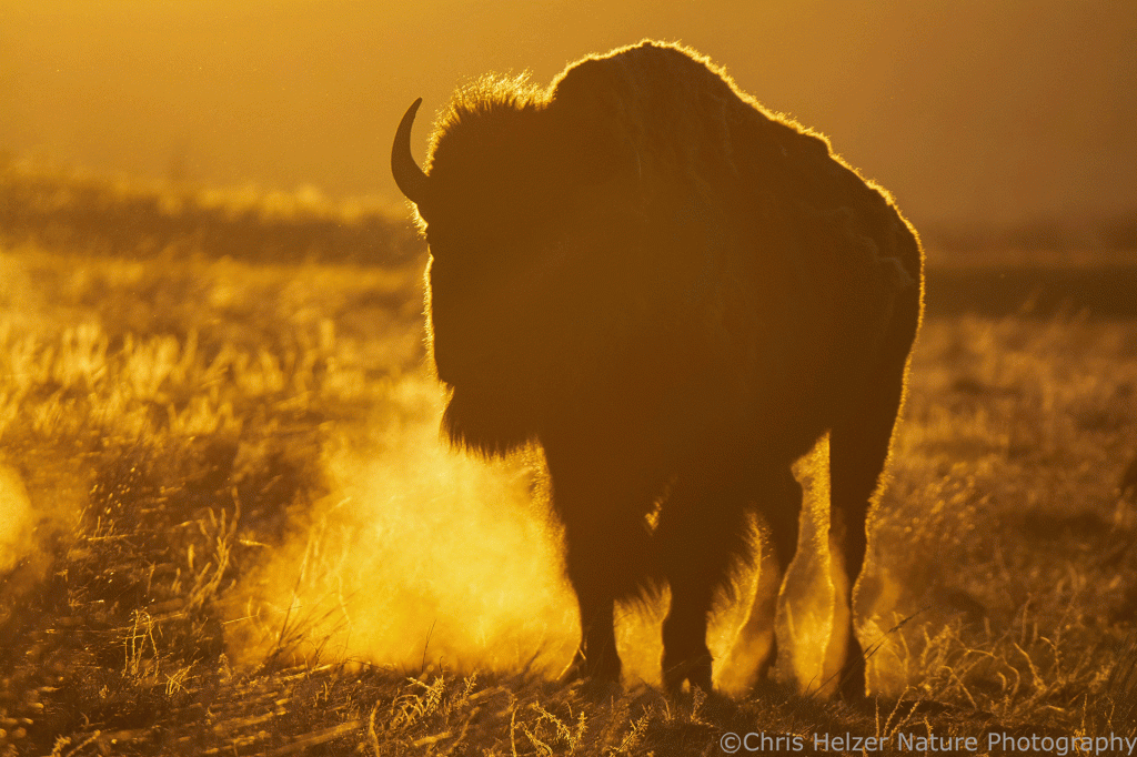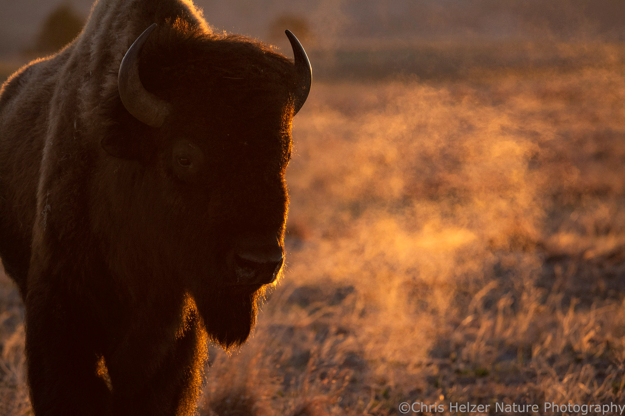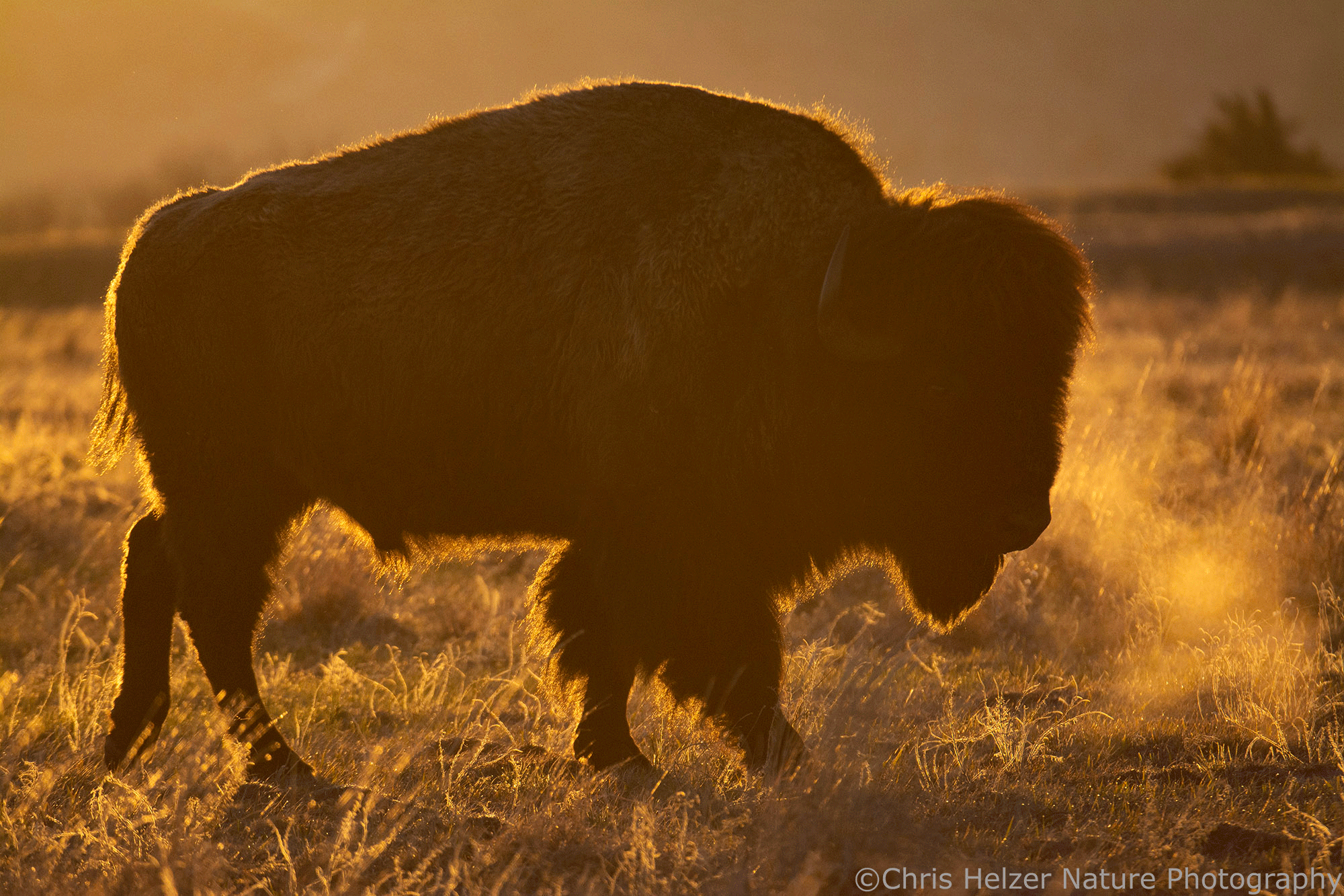 But then I went up to the Niobrara Valley Preserve this week to help with a prescribed fire and got distracted. The morning after the fire, I drove my truck into one of the two big bison pastures at the Preserve. Despite being in their pasture, I wasn’t really looking for bison. Mostly, I was hoping to find some early wildflowers and/or insects and the 10,000 acre pasture was the closest prairie area to headquarters. However, just as the morning sun popped over the horizon, I crested a hill and saw a small group of bison bulls between the sun and me. “Fine,” I thought, “I’ll just grab a couple quick photos and then get back to flower/insect searching.”