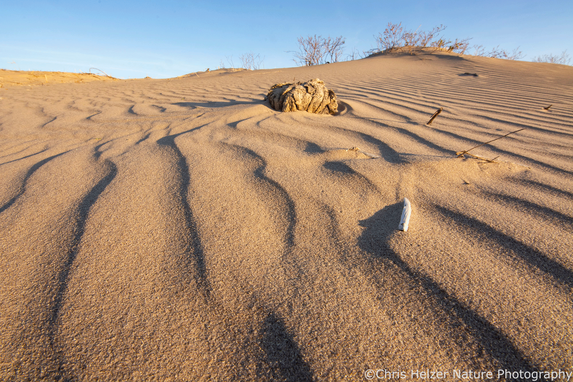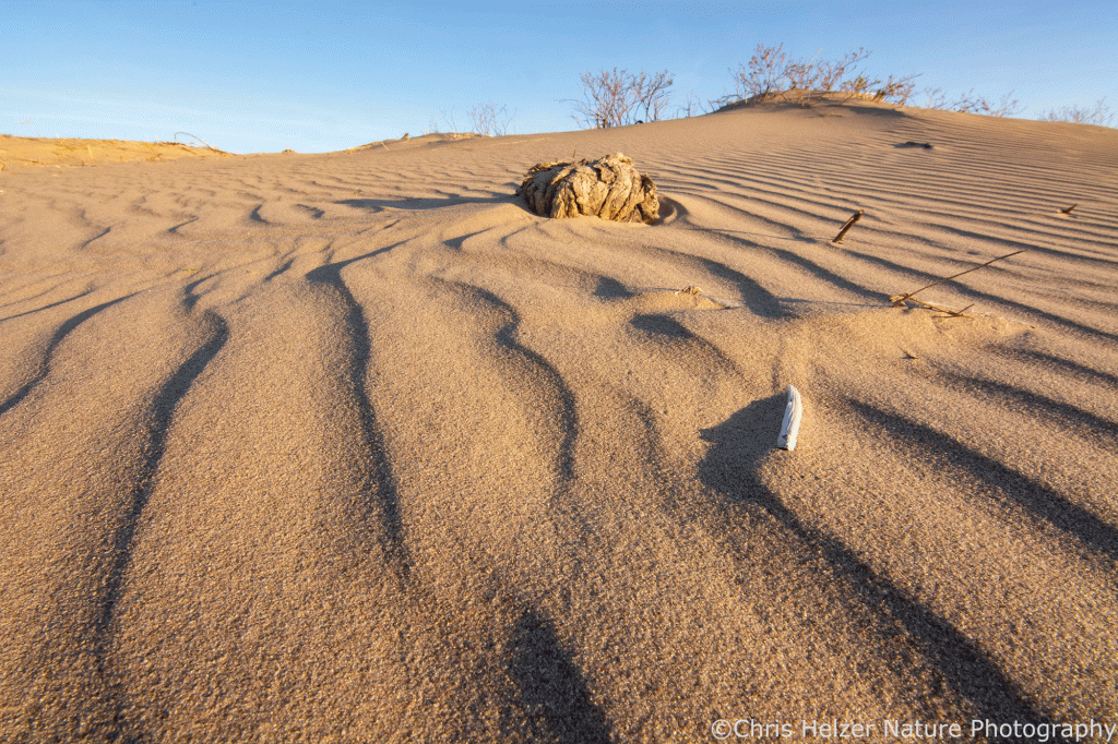 Wind-created patterns in a sand blowout, including around a pile of bison manure in the background. Sand and poop – the subject matter all photographers seek out.