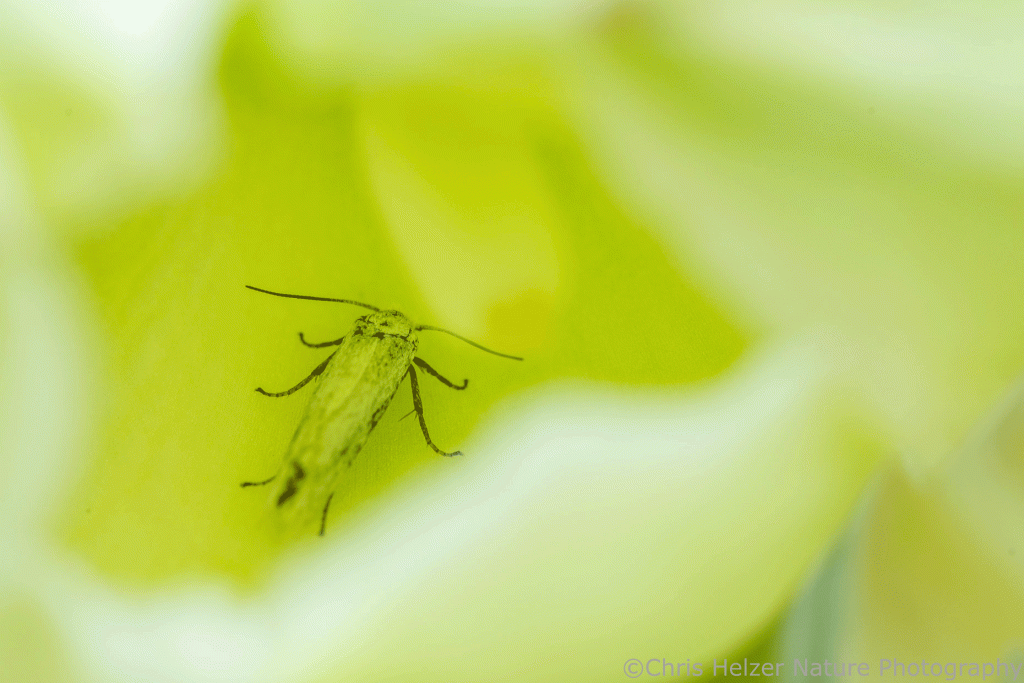 Yucca moth resting in a yucca flower. Nikon 105mm macro lens. ISO 320, f/14, 1/60 sec.