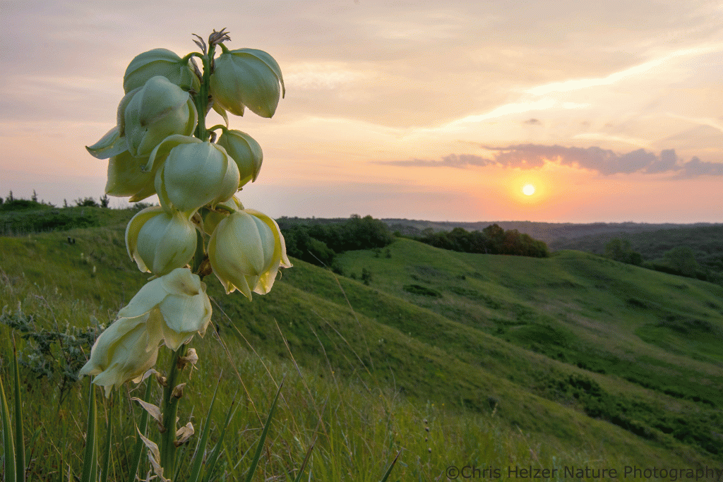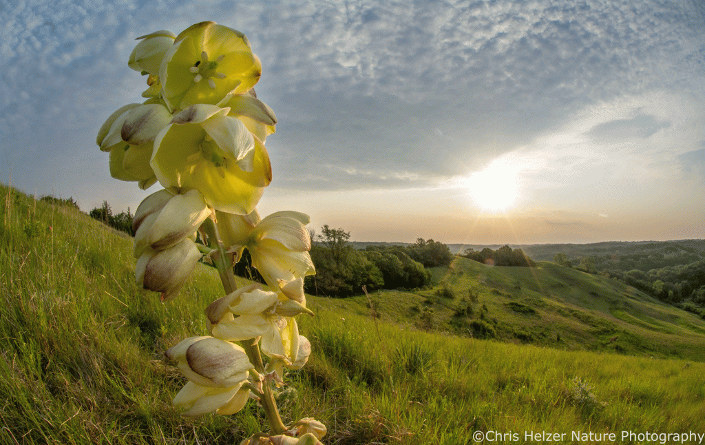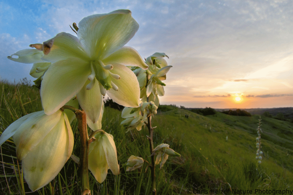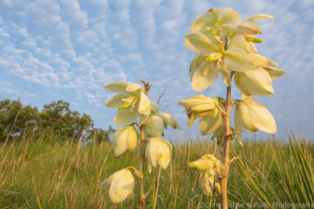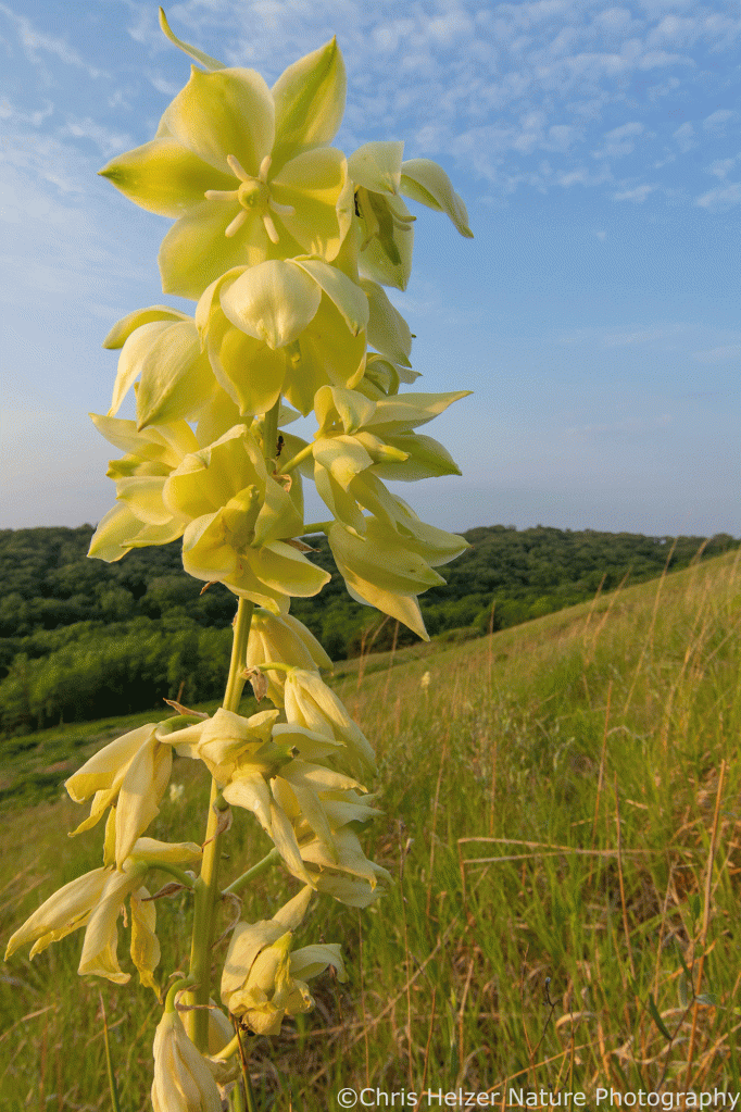Yucca (Yucca glauca) flowers in the Iowa Loess Hills at sunrise. Tokina 11-20mm wide angle lens @20mm. ISO 500, f/16, 1/50 sec.