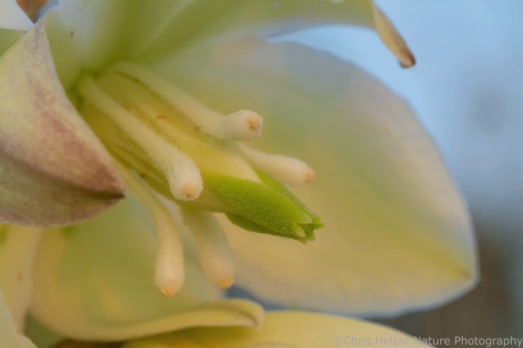 Close-up of the inside of a yucca flower. Nikon 105mm macro lens. ISO 500, f/18, 1/160 sec.