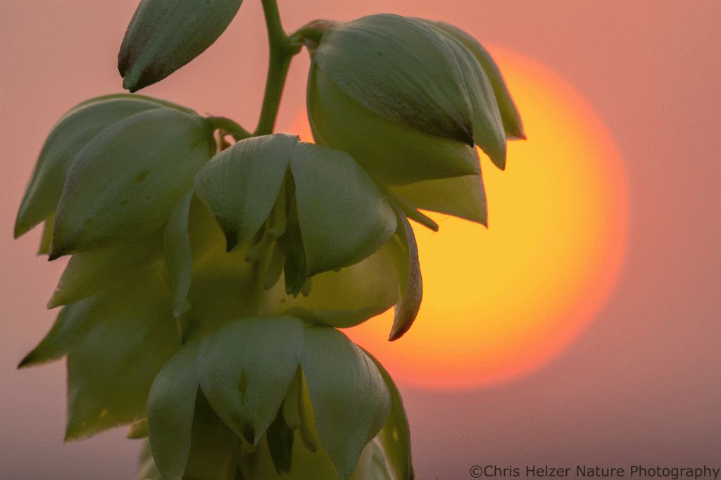 The prairie had quite a few blooming yucca plants, as did lots of other hills in the neighborhood. There were other flowers, too, but it was really hard to ignore the visual power of the yucca plants. I didn’t try very hard to ignore them. As the sun first peeked above the horizon, I grabbed my long telephoto and played around with various compositions that included the sun behind yucca flowers. Following that, I tried other lenses and perspectives until the sun finally rose high enough that it lost most of its color.