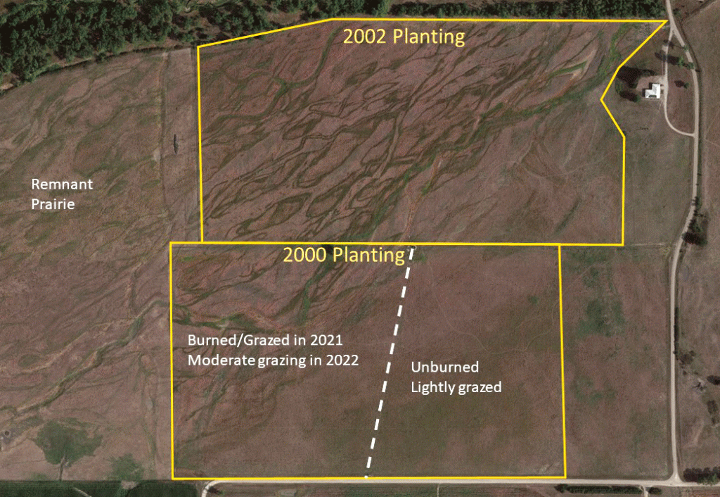 If you’ve glanced at the captions of those photos, this next statement won’t be a surprise. All four of those photos were taken on the same day from the same prairie planting. What in the world could explain the huge differences between the conditions across that single site? The site, by the way, is about 64 acres in size and was planted with 218 species in late 2001 and early 2002. Here’s a map, showing both the 2002 planting and another one planted in 2000 that I’ll talk about shortly. You can also see a remnant prairie to the west (left) of both those plantings.