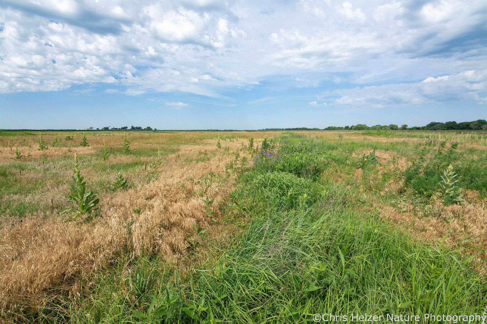 The differences in soil texture, nutrients (especially nitrogen), and organic matter across that old alluvial network have tremendous influence on plant communities – especially in dry years. Here’s one more photo of the same 2002 planting that really illustrates that. The green stripe down the middle is dominated by native grasses like big bluestem and native forbs like stiff and Maximilian sunflowers (and lots of others). The areas on each side are full of annual bromes and ‘weedier’ native plants like tall dropseed, daisy fleabane, hoary vervain, and others, as well as a few mullein plants.