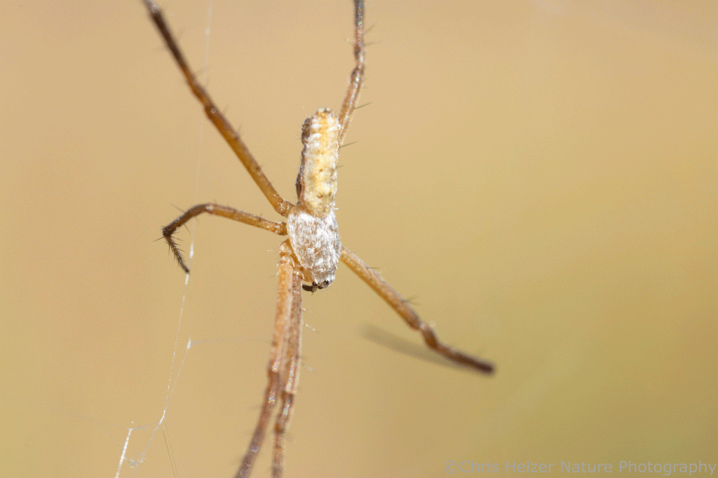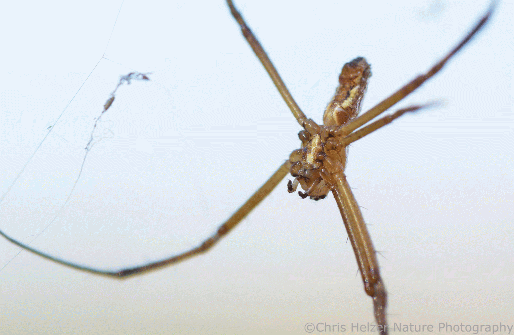 Once he was in position, I figured the drama would ramp up as the female tried to grab him and hold him there until he did his job. She didn’t. Also, he only stayed in position very briefly (a second or so) before quickly skedaddling up onto the web again. He stopped a couple inches away and sat for a while.