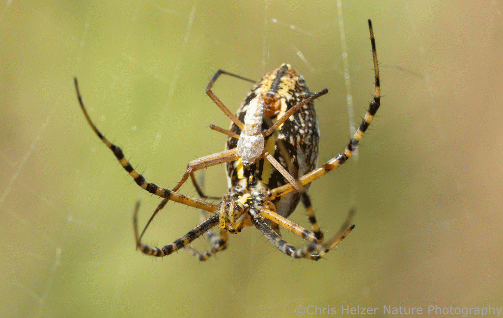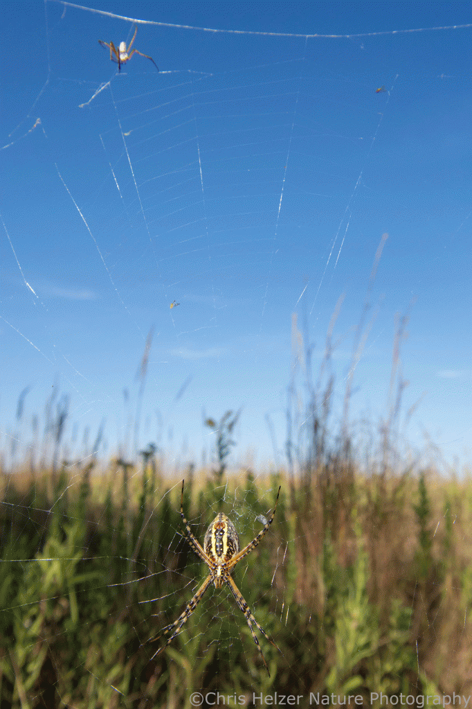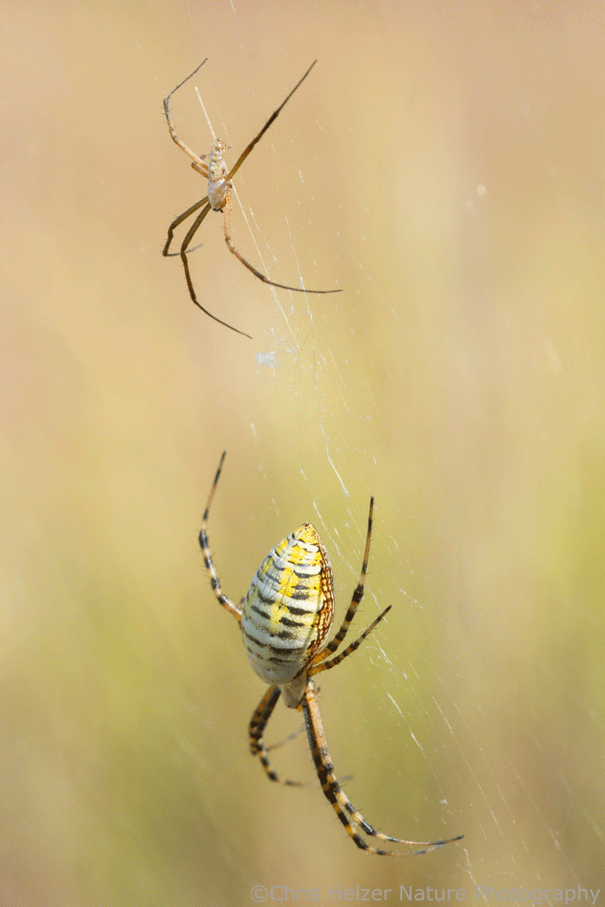 When a male shows up on a female’s web, it’s usually because it’s mating time. This is a very tricky situation for males, who often get caught and eaten as soon as copulation is completed. You might say the trick for the male is to get mating wrapped up without getting himself wrapped up.