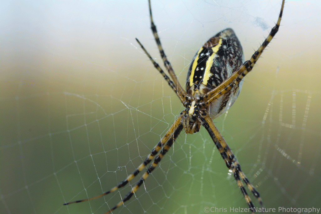I did find some interesting insects to photograph, but also spotted several big banded garden spiders (Argiope trifasciata). Since the trees were blocking some of the breeze, I decided to try photographing them on their gently-undulating webs. As I tried to decide where to start, I noticed a smaller male spider hanging out at the top of a big female’s web. It was far enough away that I had to back off and use a long telephoto lens to get both spiders in the same shot.