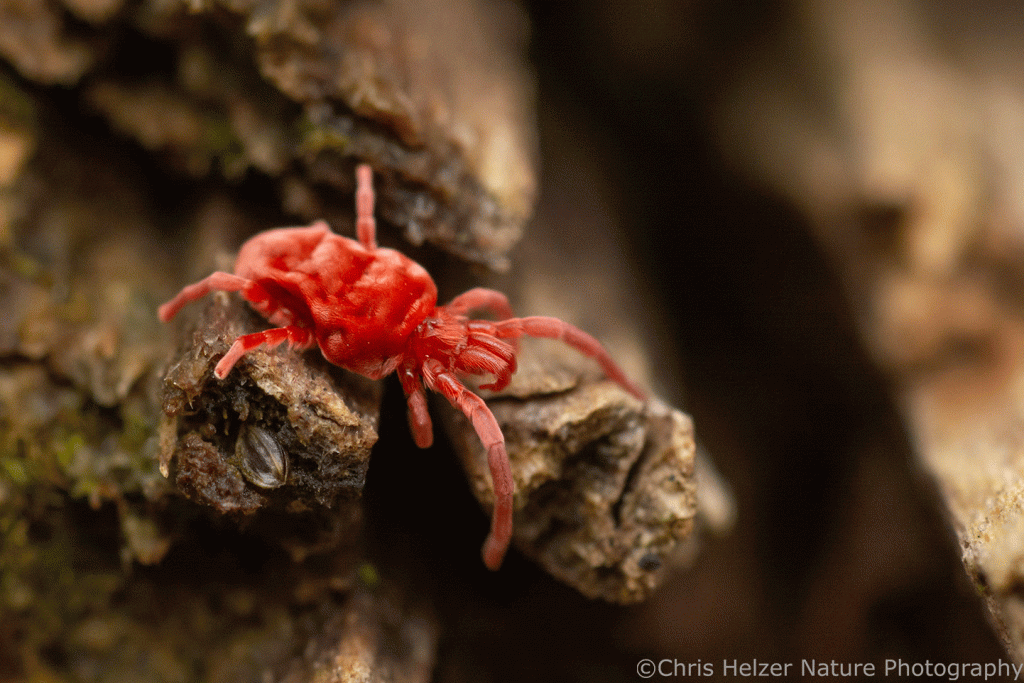 A tiny red velvet mite on a rotting log. 105mm macro (cropped). ISO 640, f/13, 1/100 sec.