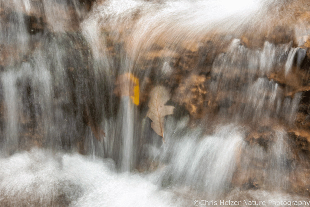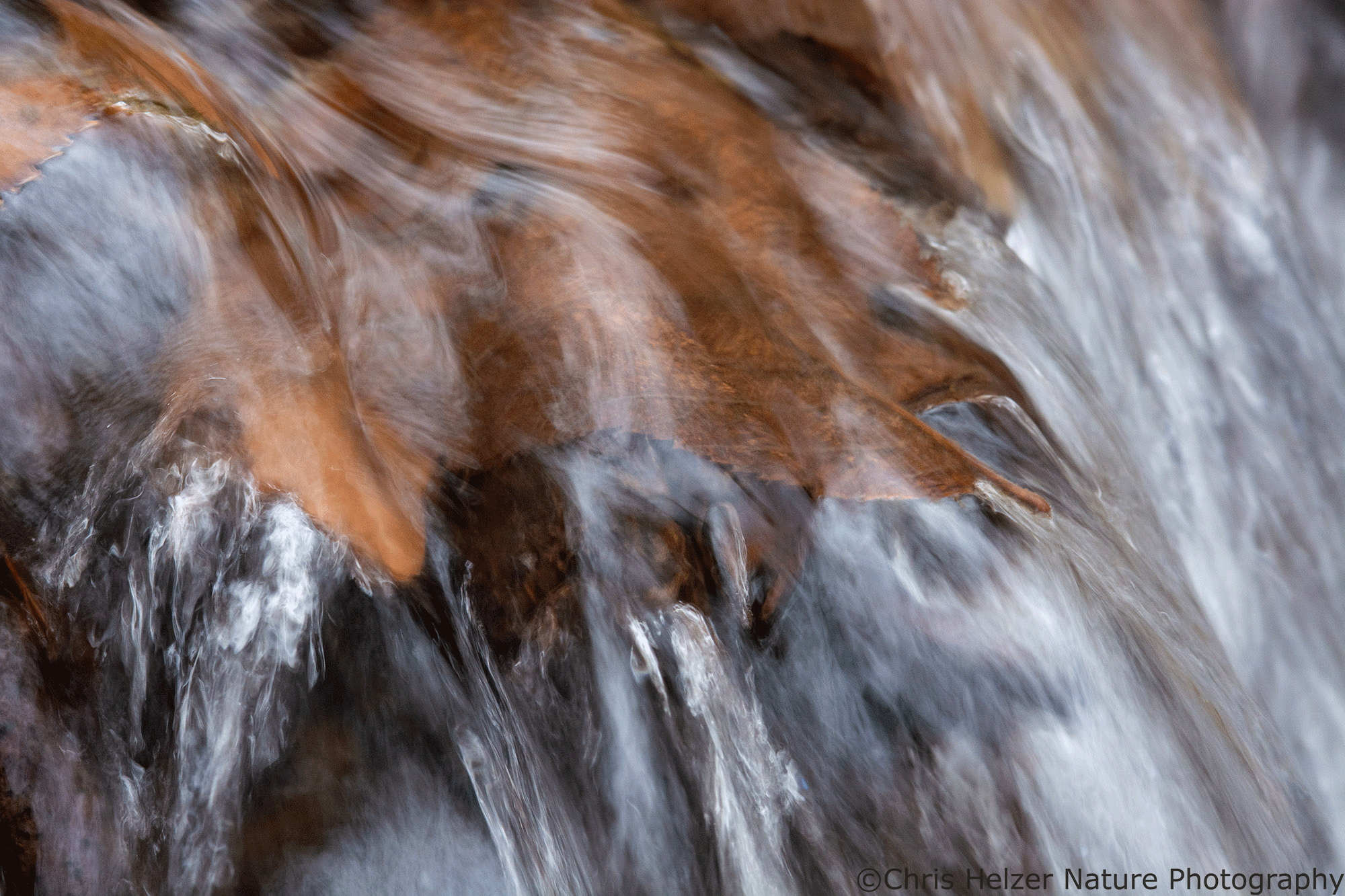 Water cascading over leaves. 105mm macro lens. ISO 640, f/13, 1/60 sec.