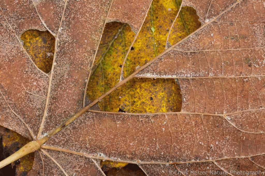 A basswood leaf with holes. 105mm macro lens. ISO 320, f/11, 1/60 sec.