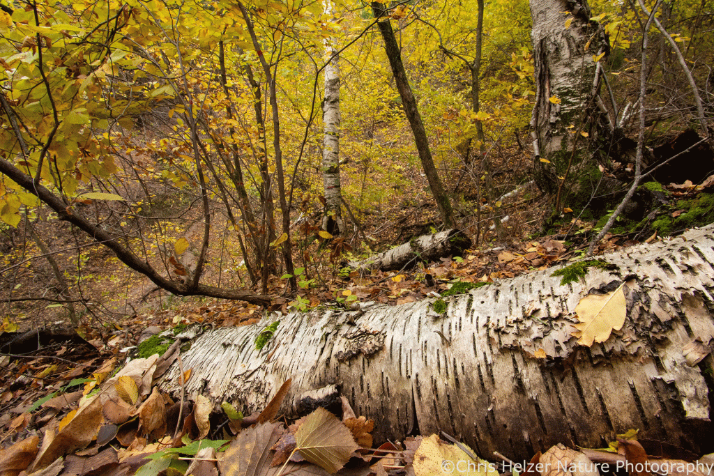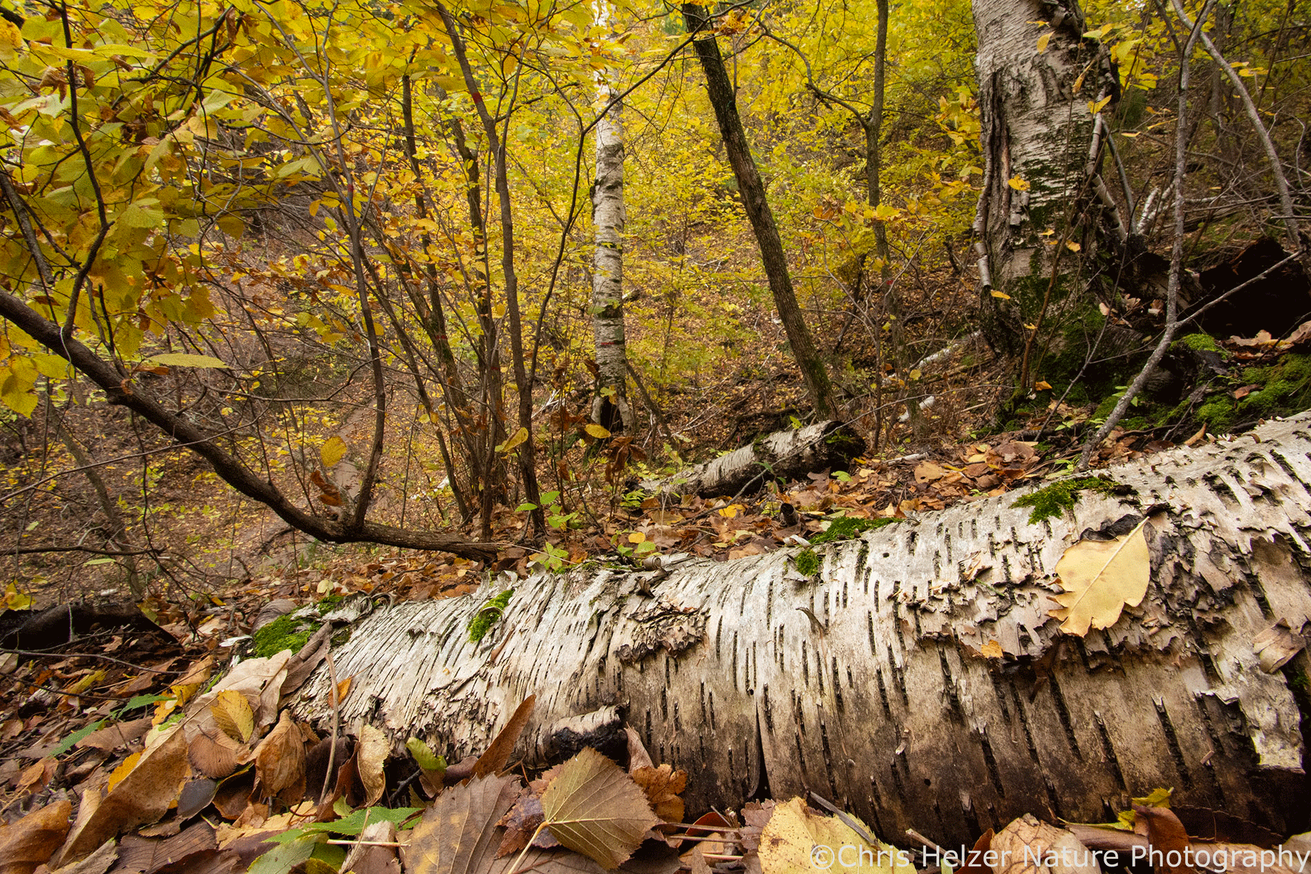Paper birch surrounded by fall color. 10-20mm lens @10mm. ISO 1250, f/16, 1/100 sec.