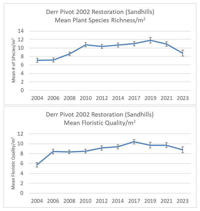 2. So – to the data! In Figure 1, above, you can see that both the mean species richness and mean floristic quality of this restored prairie increased for several years and then mostly leveled out. The 110 acre hilly sand prairie just south of the Platte River was planted in November 2021 with 165 species. It took awhile – maybe until 2006 or 2010, depending upon which metric you look at – for those species to fully establish into a community.