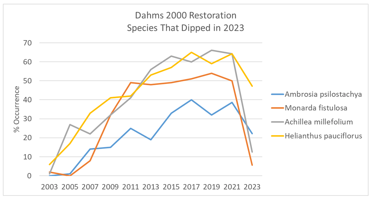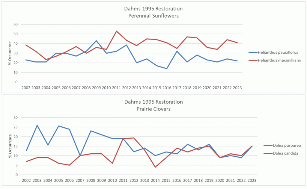Figure 10 shows the frequency of occurrence of four forbs at the Dahms 1995 planting. In the top graph, you can see that the stiff sunflower population seems very stable, and didn’t seem to decline in occurrence between 2021 and 2023 like it did in all three of the other sites. In fact, both stiff and Maximilian sunflowers occurred at almost the exact frequency in 2023 as they did back in 2002.