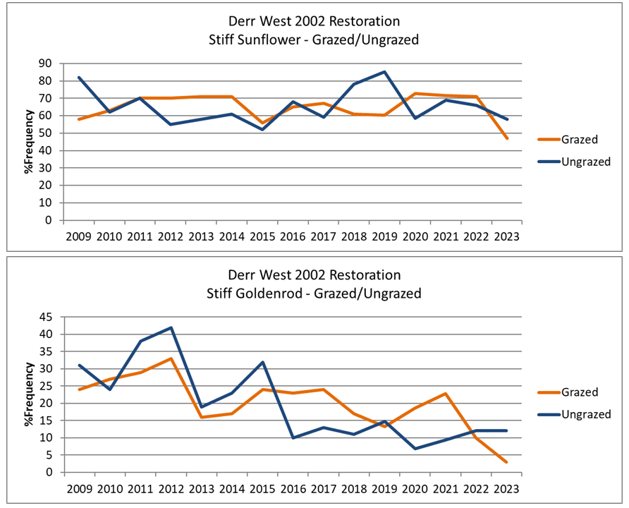 The graph in Figure 4 shows four perennial forbs that declined between 2021, with two of them (wild bergamot and stiff sunflower) showing particularly steep drops in occurrence. Stiff sunflower also showed that pattern in the 2002 restoration, as well as in the Derr West 2002 restoration that I’ll be featuring next. That’s three sites, all with similar management and drought conditions, in which stiff sunflower has had a bad year or two. Is that a pattern that means something? Good question. Hang on to it until we get to the fourth site.