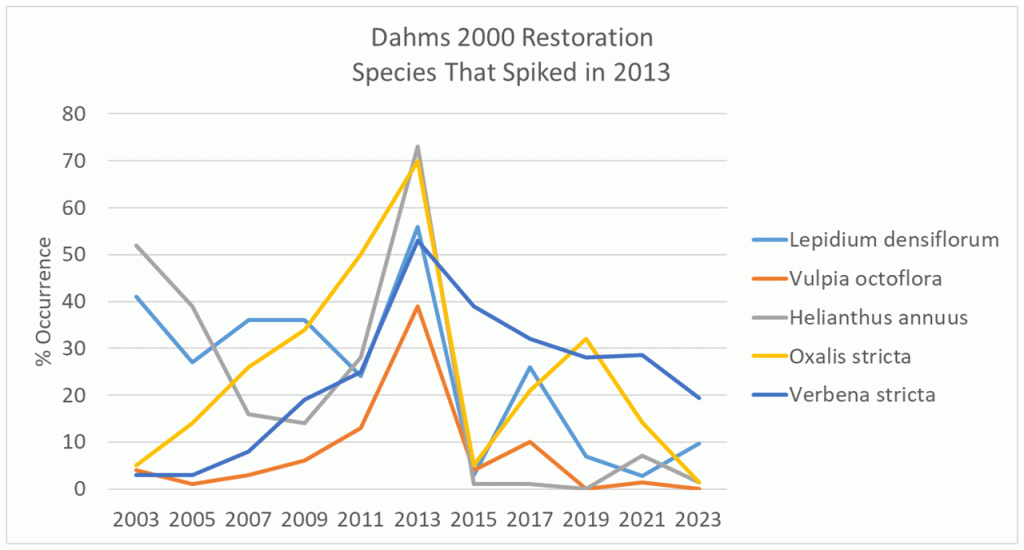 Figure 5. These five species all had significant spikes in frequency of occurrence in the year following the 2012 drought. They are small pepper grass, six-weeks fescue, garden sunflower, yellow wood sorrel, and hoary vervain.