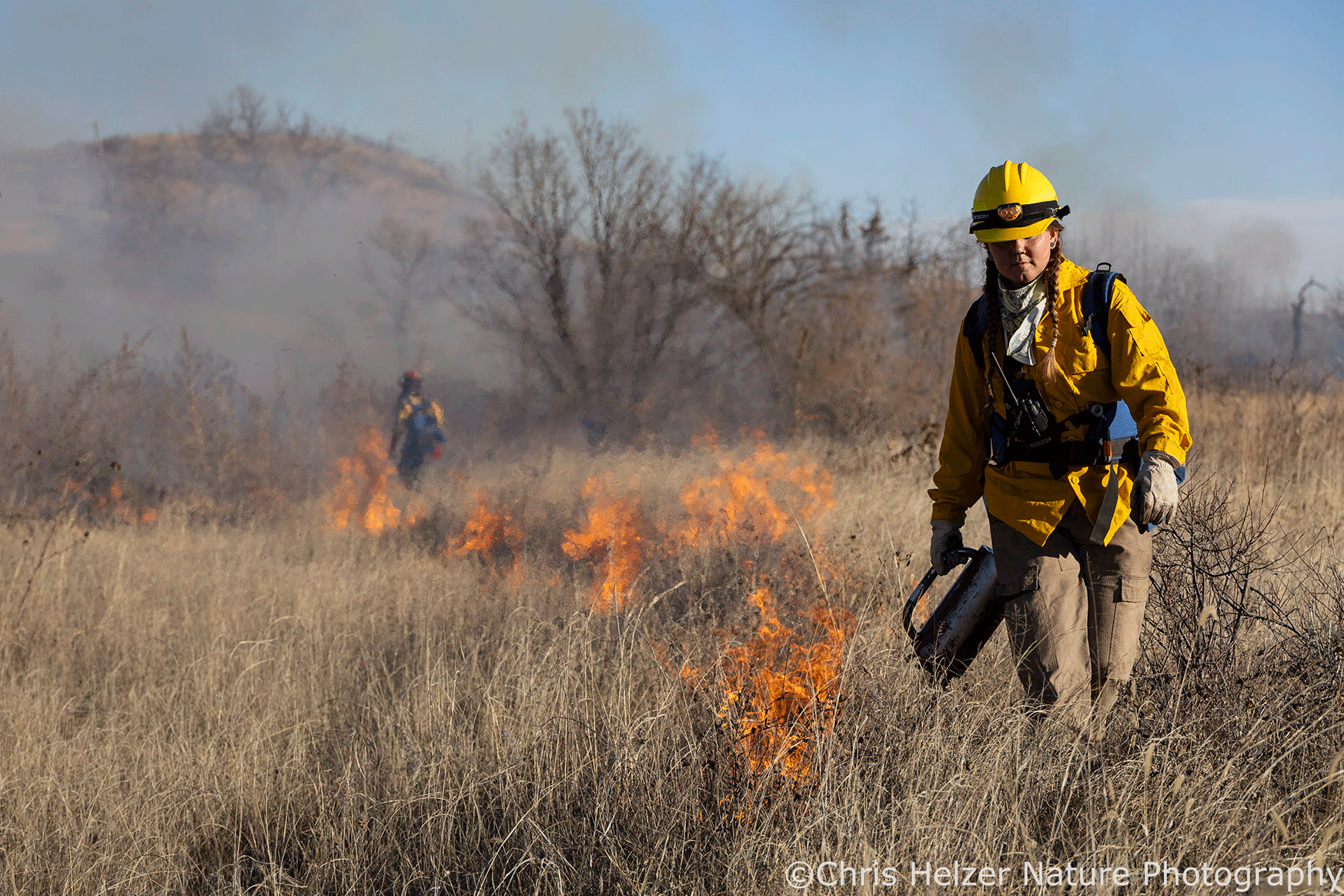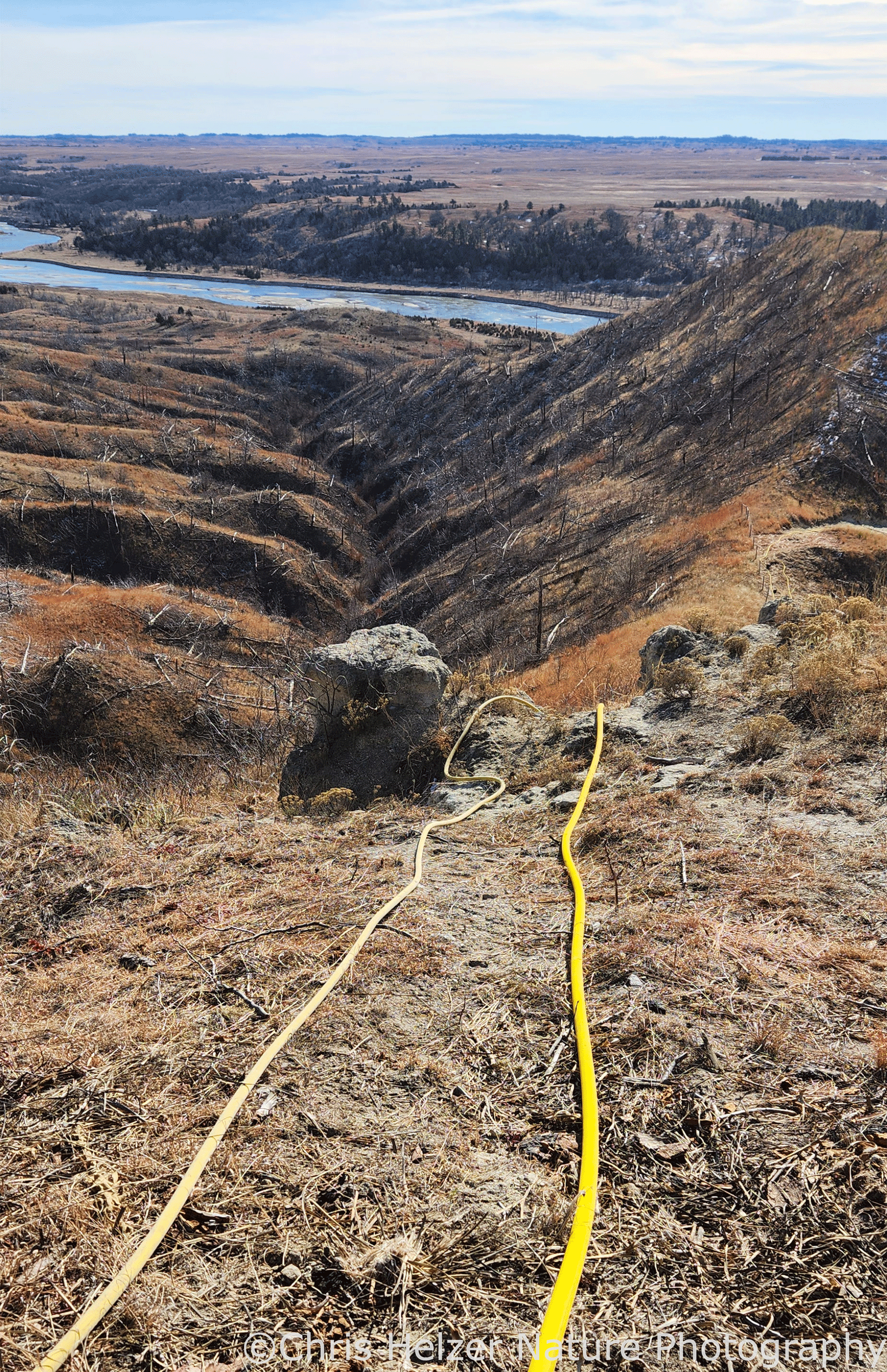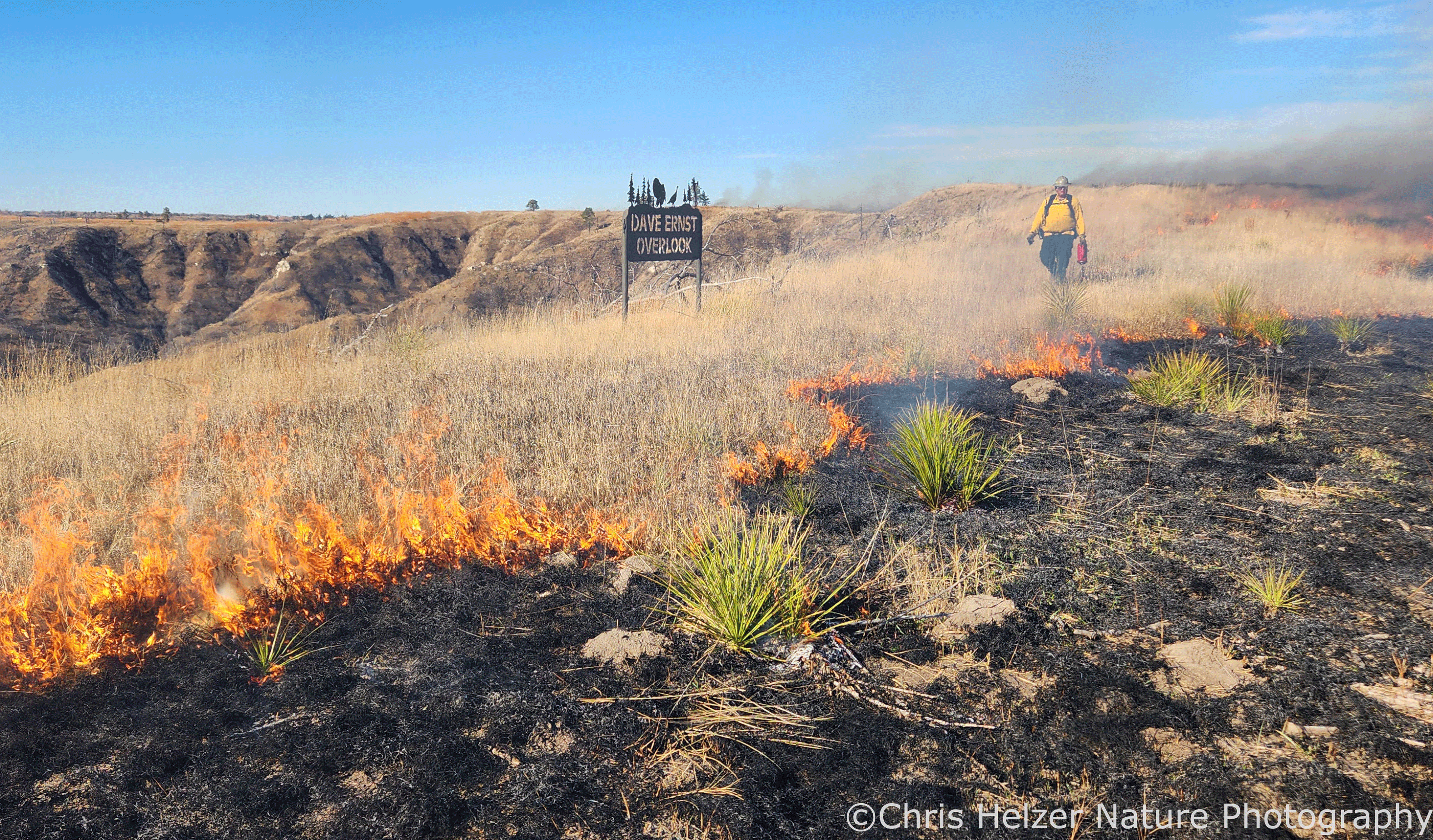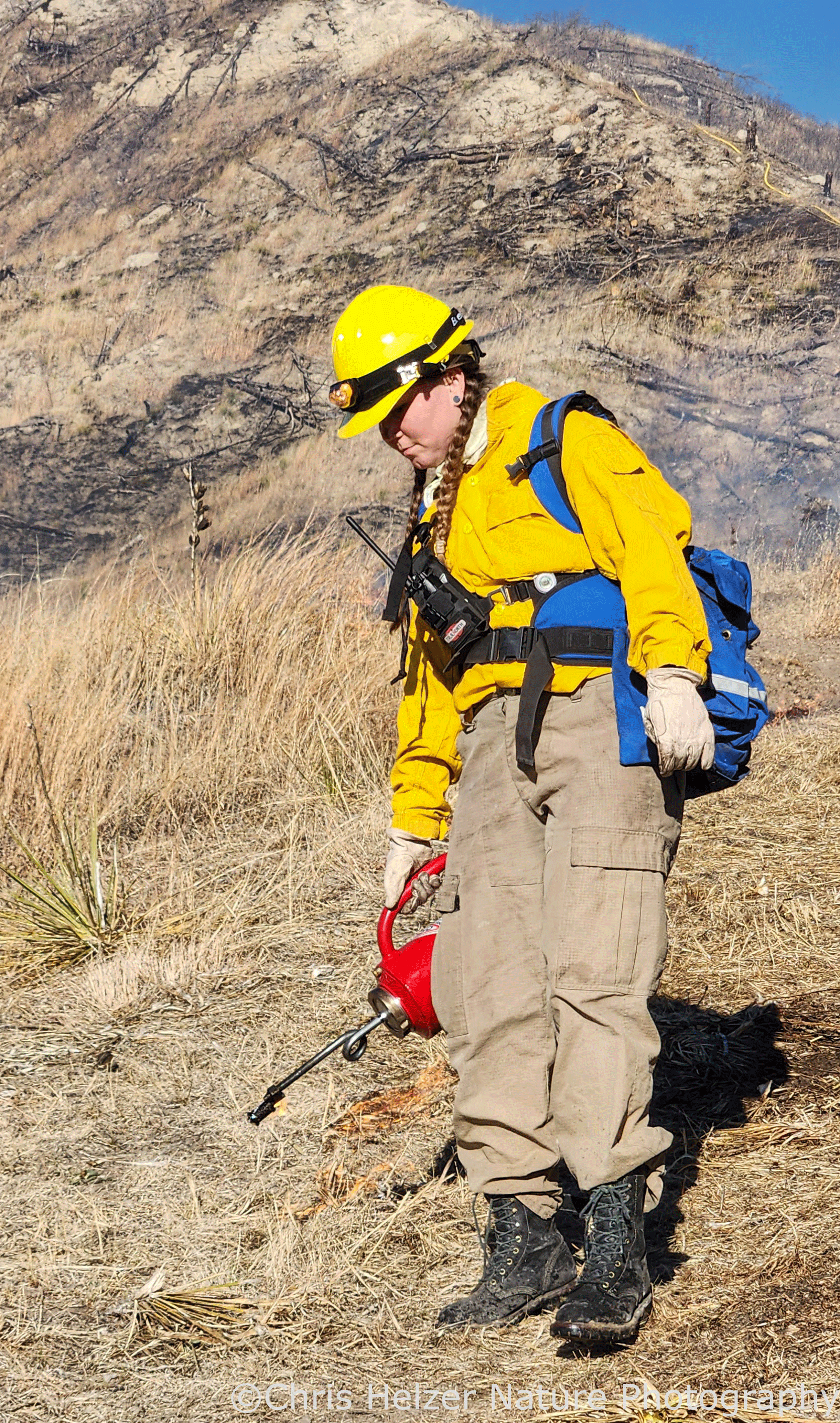 Former Hubbard Fellow (and current Nebraska Game and Parks Commission employee) Chelsea Forehead was part of the crew. Here she’s igniting down one of the steep slopes.