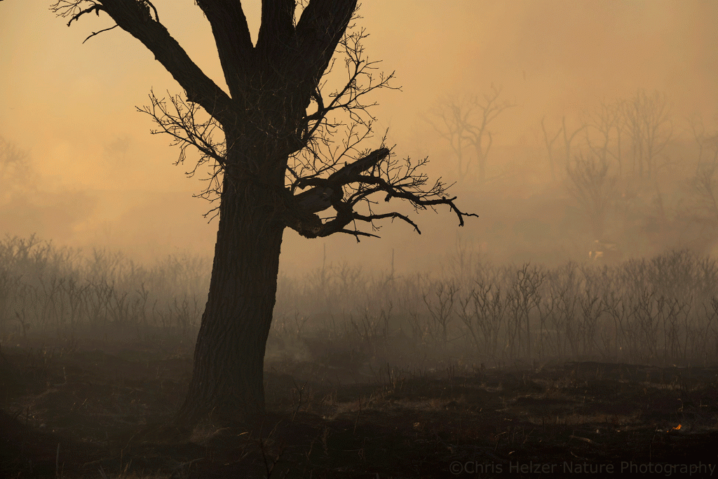 A smoky scene with a tree in the foreground and sumac and other shrubs behind it.