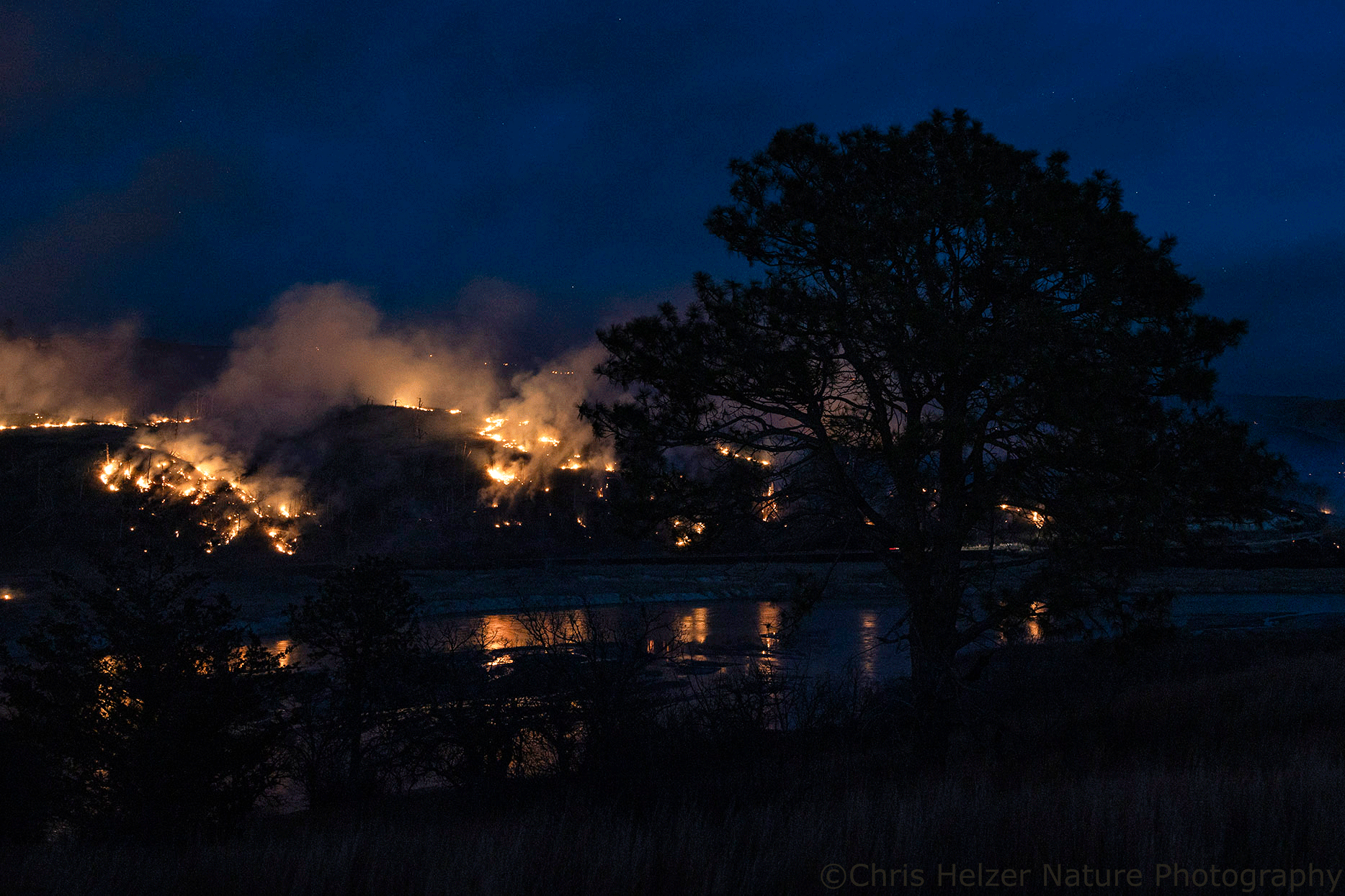 As darkness settled in, the remnants of the fire kept burning. We knew the bigger logs and standing dead trees would burn through the night, but we had wide bands of blackened ground around the perimeter to contain the fire. The overnight forecast was also favorable, with high humidity and temperatures well below freezing, which would keep the fire from spreading. After assuring the perimeter was secure, the crew retreated to the Preserve headquarters just across the river to watch from there while putting away equipment, grabbing some food, and reviewing the day’s events.