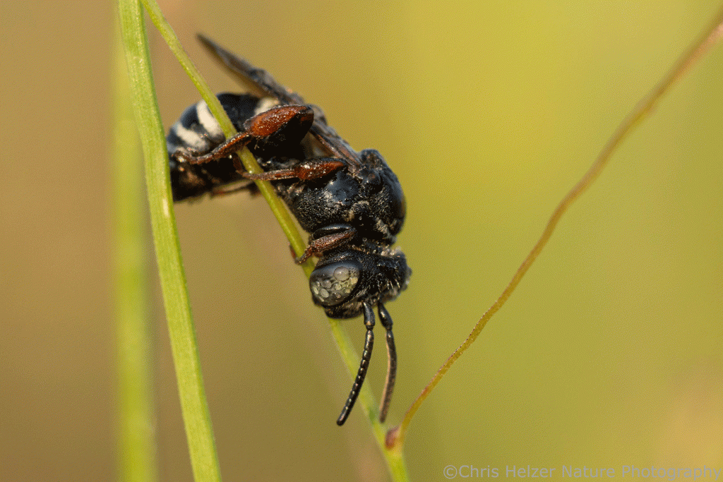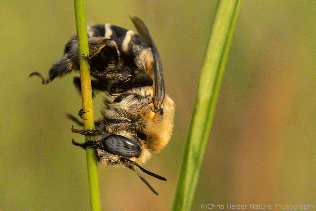 A lot of bees sleep overnight suspended in the vegetation of a prairie. Most of these are male bees, which don’t have nests to protect (or to protect them). Female bees of most species have built themselves a burrow in the ground or plant stem and hunker down there through the night. The males (and cuckoo bees, which lay their eggs in other bees’ nests) have to just make do with what they can find. As a result, they’re great photo subjects for me before they warm up and dry out enough to fly off into the new day.