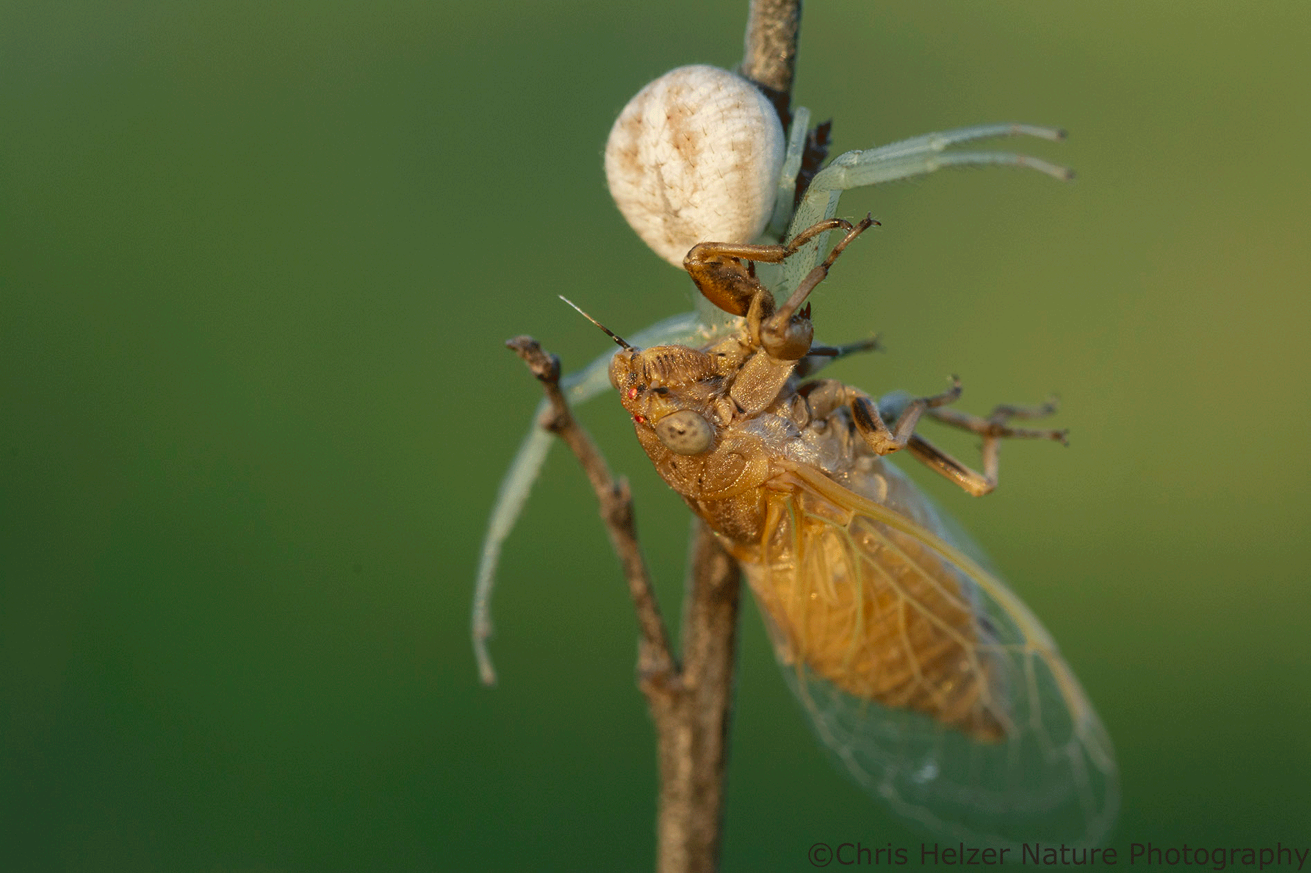 D. So, another interpretation might be that the crab spider ambushed the cicada and paralyzed it with a venomous bite when it got within range?