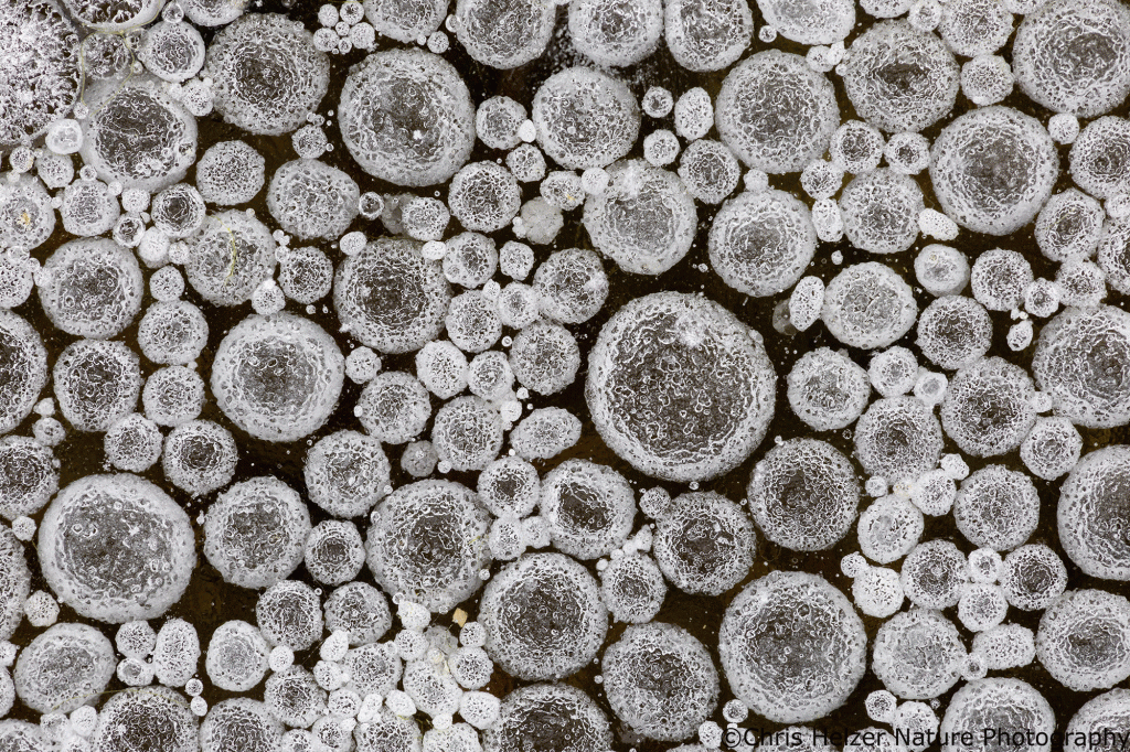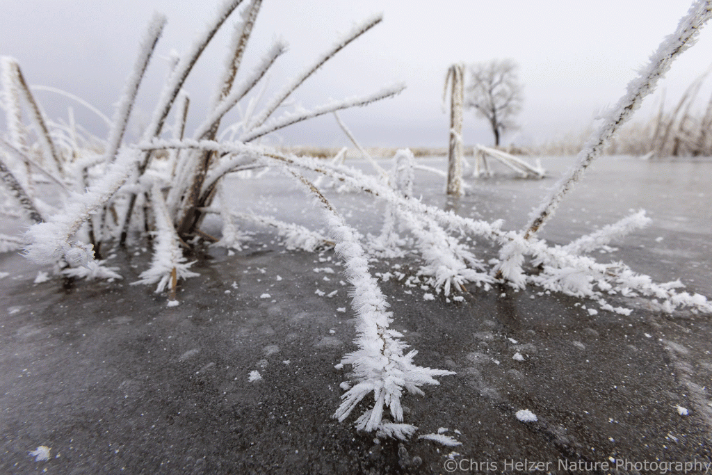 Of course, a good macro lens will always be my mainstay, and frost photography is a lot of fun with that lens. In this case, I used a Canon 180mm macro lens. Some of these were tricky because the ice was thin enough that I was lying on the bank and resting my elbows and the camera (very lightly) on the ice to get the photos. If I’d have put any more weight on the ice, it would have cracked and I’d probably have been shopping for a new camera and lens. What can I say? The adrenaline keeps me warm.
