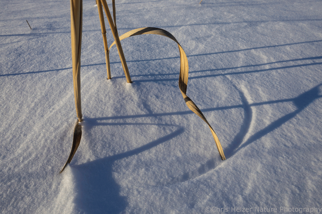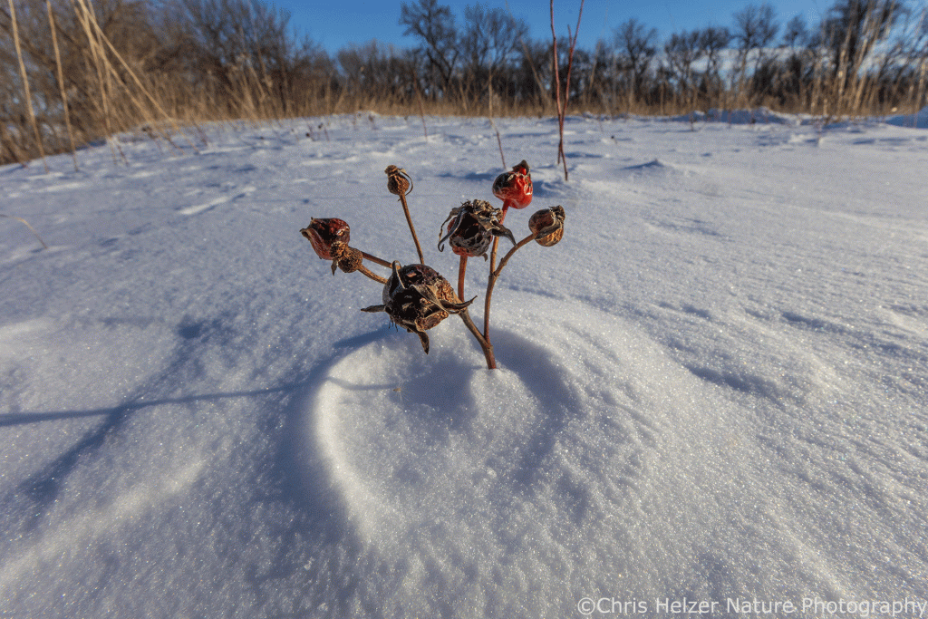 Wild rose hips (Rosa arkansana) are great fodder for winter photography because they provide a splash of scarlet at a time of year when color is generally muted. Because I pay attention to them, I often see evidence of them being eaten by animals. They’re apparently a high quality source of food and I frequently see pheasant and grouse tracks around them.