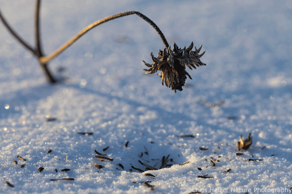 One of the best parts of prairie hiking in the snow is the chance to see what animals have been up to. This month, I’ve seen a ton of dark-eyed juncos feeding on prairie plants. They’ve focused heavily on the seeds of Indiangrass and sunflowers. I haven’t yet photographed the birds, but I’ve taken lots of photos of their tracks and of the remnants of their feeding activity.