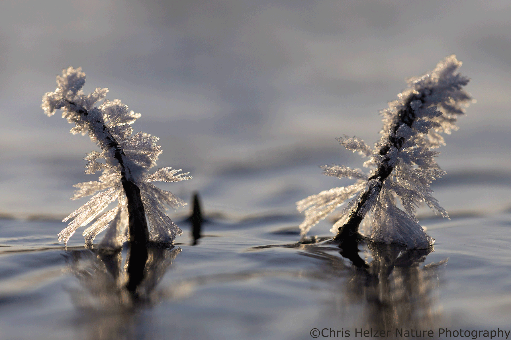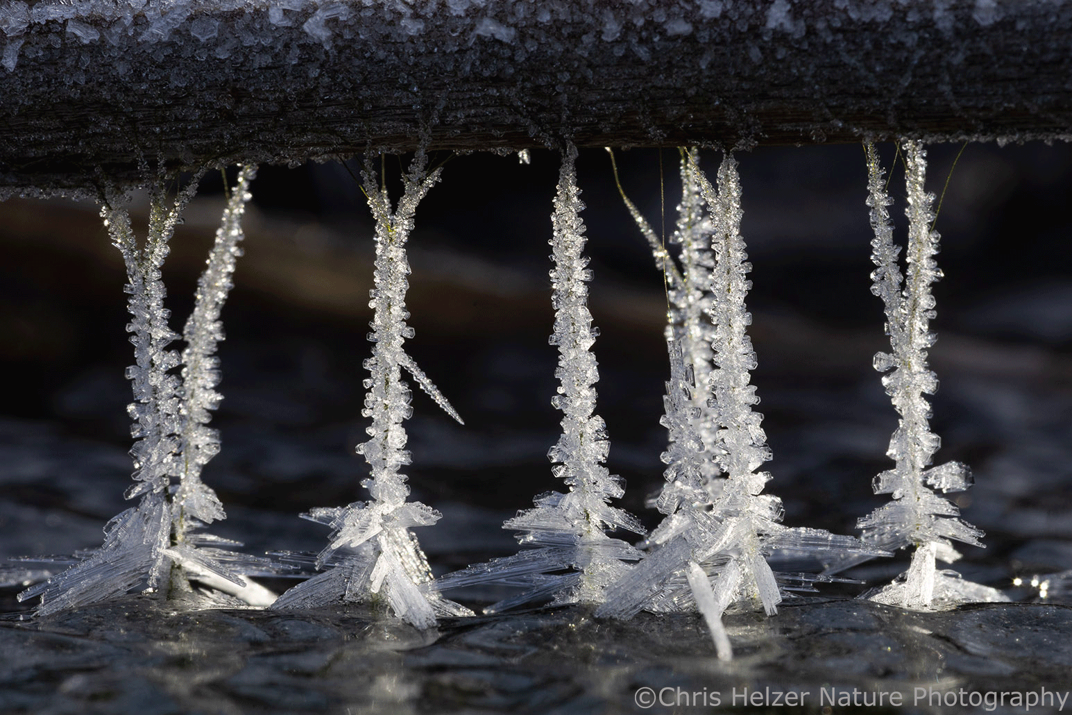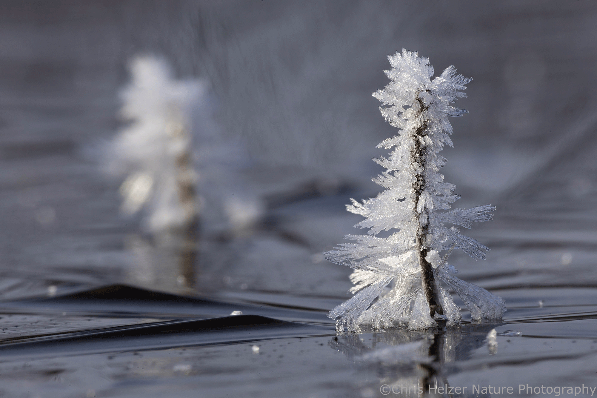 Of course, a good macro lens will always be my mainstay, and frost photography is a lot of fun with that lens. In this case, I used a Canon 180mm macro lens. Some of these were tricky because the ice was thin enough that I was lying on the bank and resting my elbows and the camera (very lightly) on the ice to get the photos. If I’d have put any more weight on the ice, it would have cracked and I’d probably have been shopping for a new camera and lens. What can I say? The adrenaline keeps me warm.
