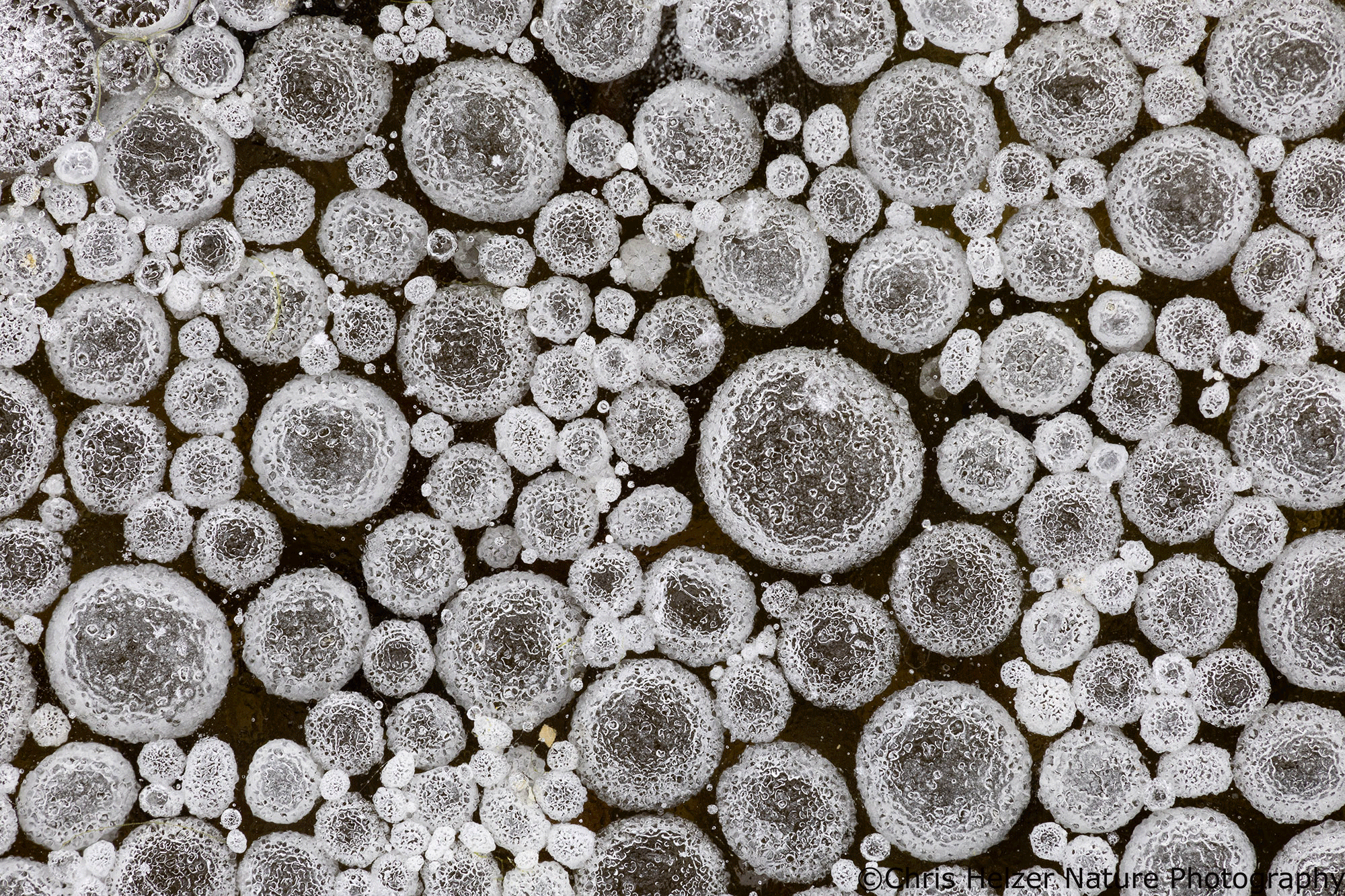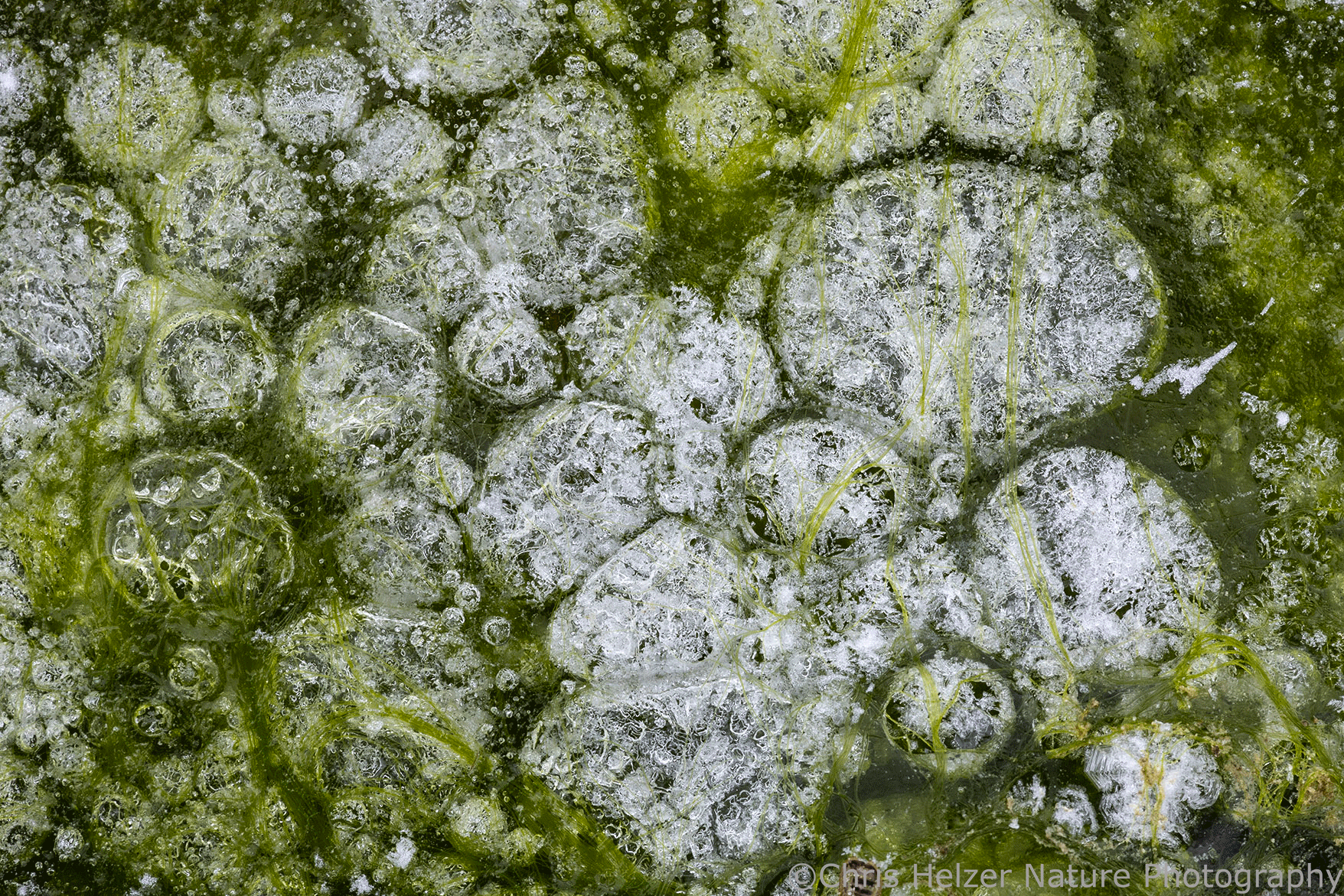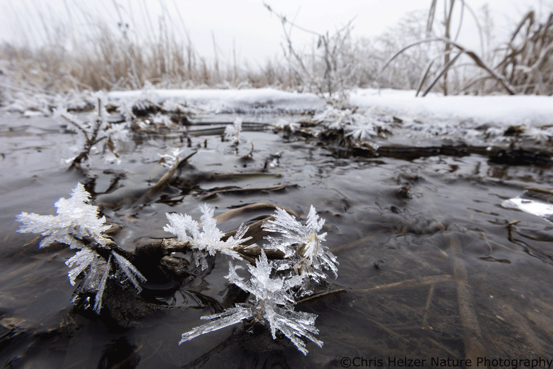 Of course, a good macro lens will always be my mainstay, and frost photography is a lot of fun with that lens. In this case, I used a Canon 180mm macro lens. Some of these were tricky because the ice was thin enough that I was lying on the bank and resting my elbows and the camera (very lightly) on the ice to get the photos. If I’d have put any more weight on the ice, it would have cracked and I’d probably have been shopping for a new camera and lens. What can I say? The adrenaline keeps me warm.