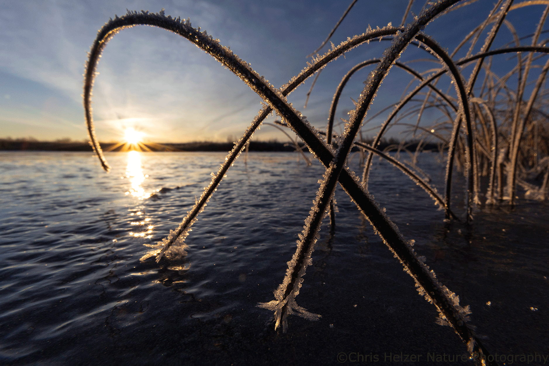 A week later, I returned to the same wetland and played around with frost and ice again, this time with a sunrise thrown in for color. I’m really enjoying my new Canon 15-30mm RF lens that allows me to focus right up to the glass on the front of the lens. The first two photos below are examples of that – the front of the lens was less than inch from the frost in the foreground, providing an amazing perspective.