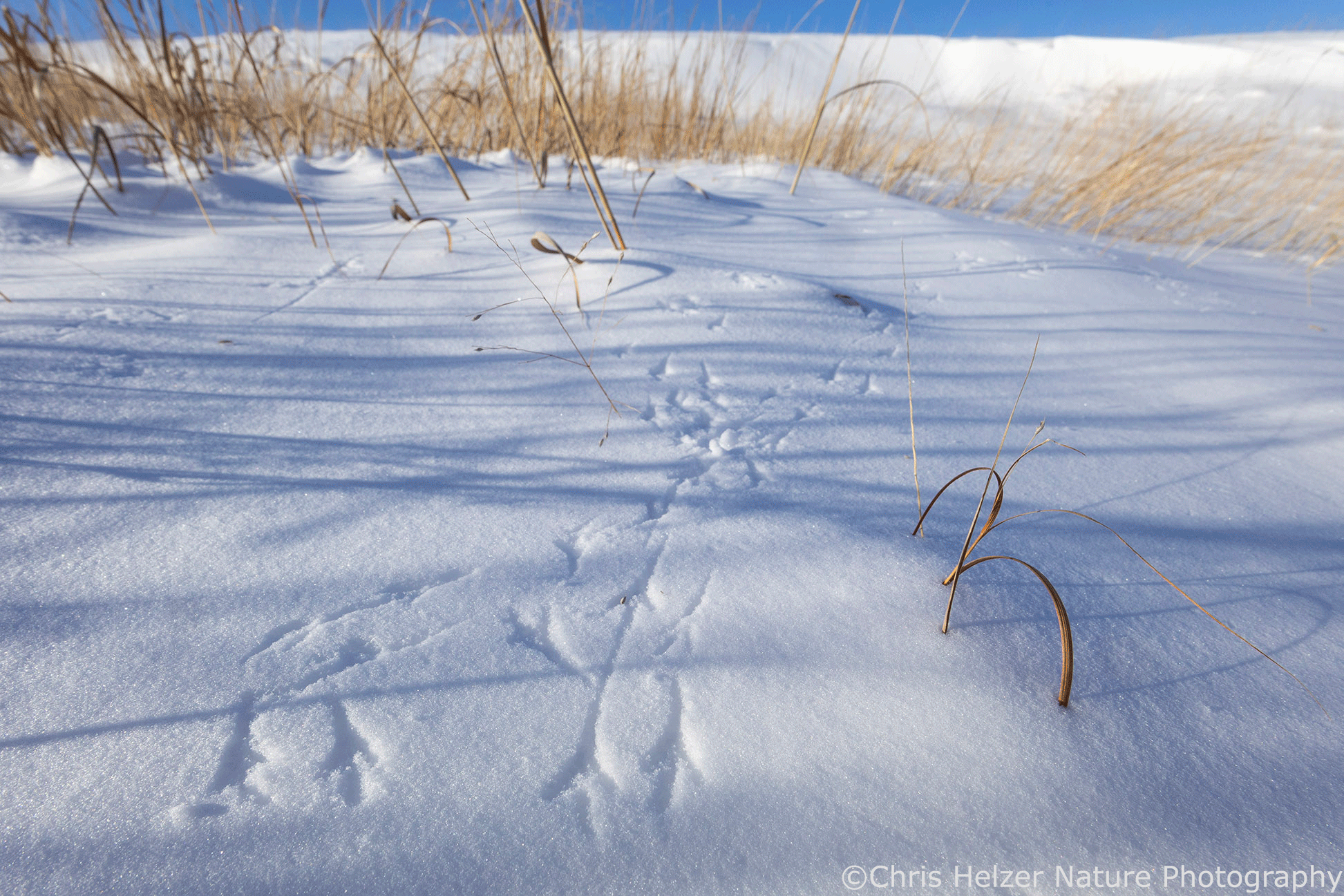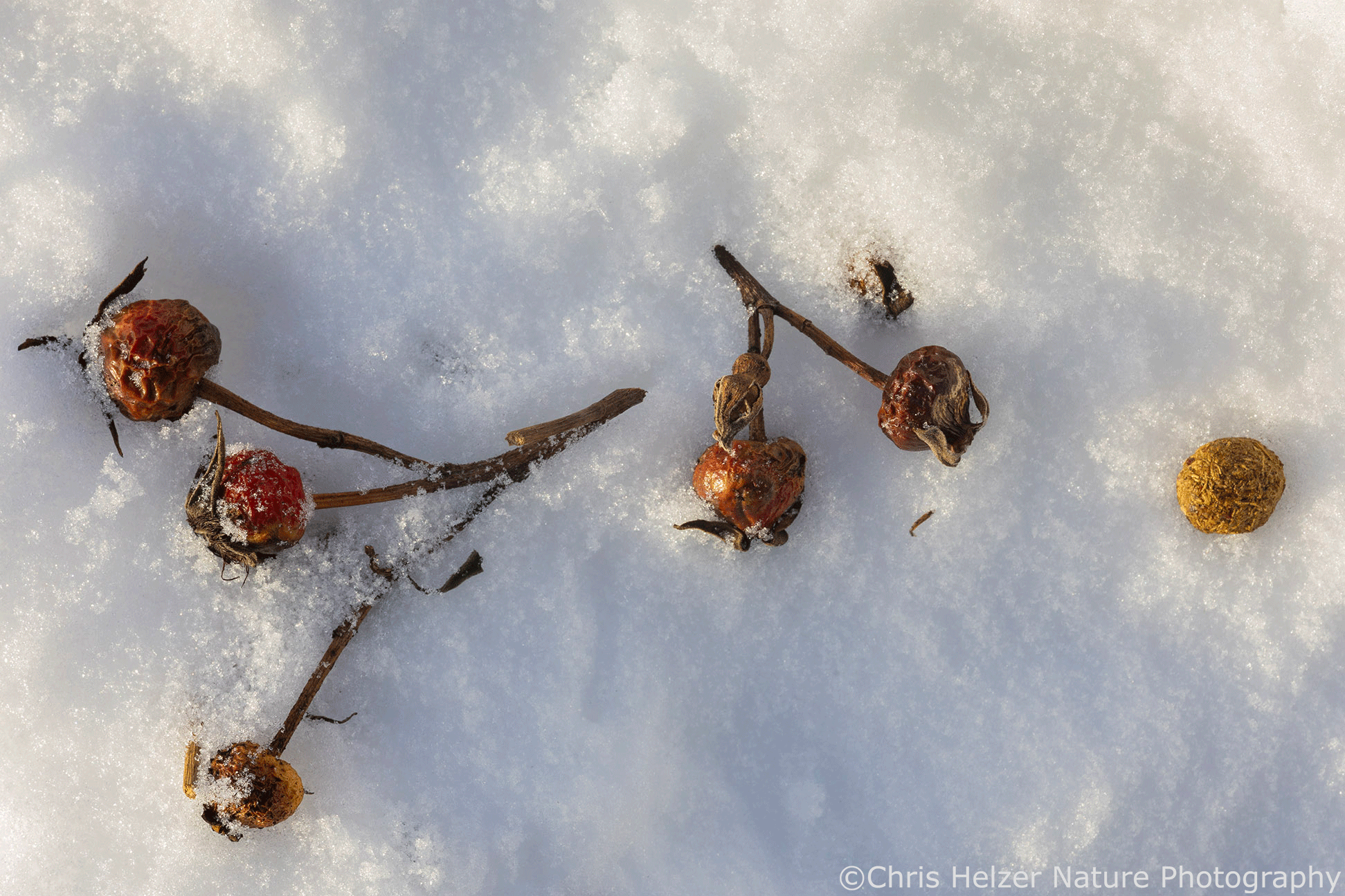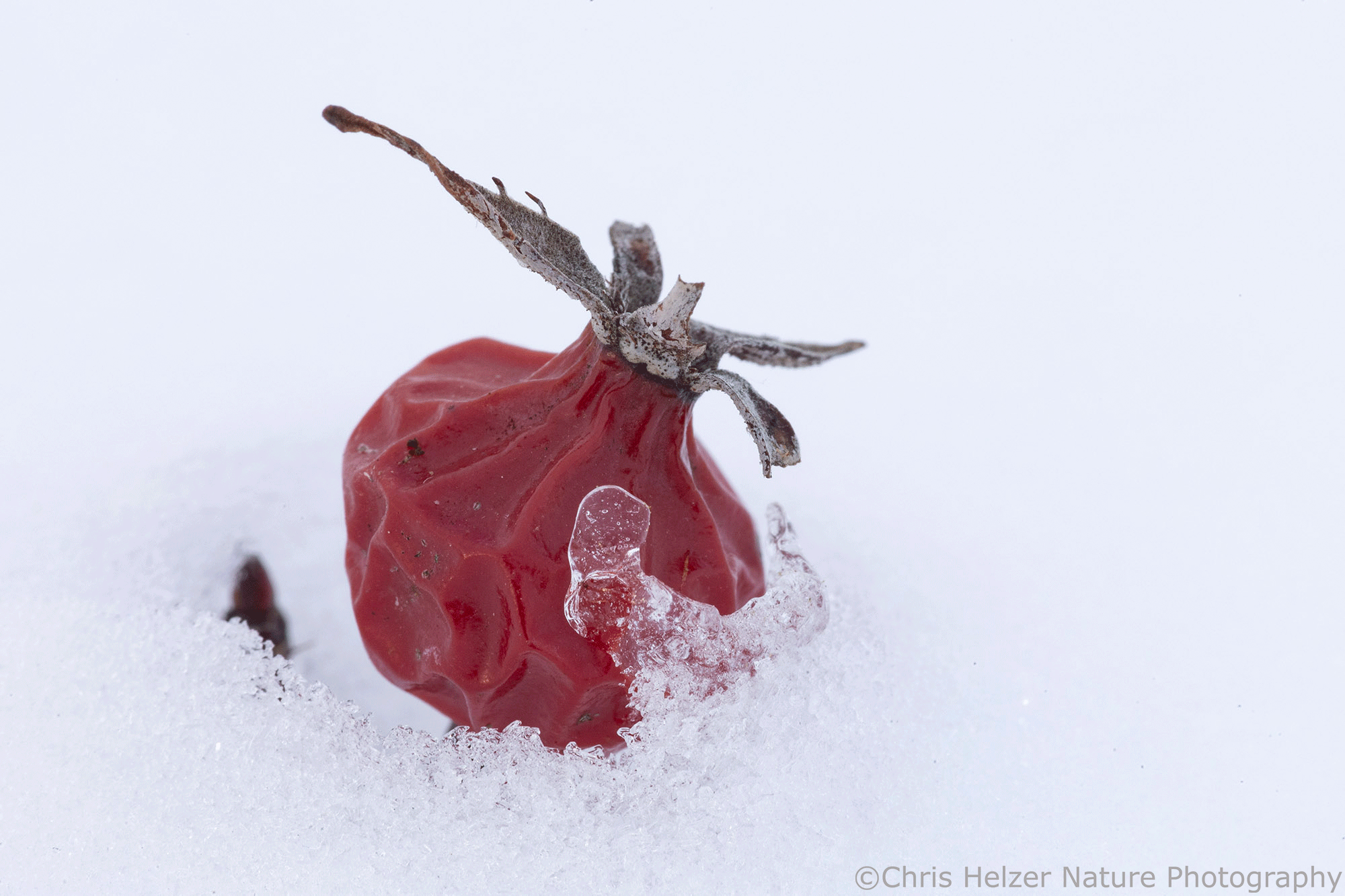 Wild rose hips (Rosa arkansana) are great fodder for winter photography because they provide a splash of scarlet at a time of year when color is generally muted. Because I pay attention to them, I often see evidence of them being eaten by animals. They’re apparently a high quality source of food and I frequently see pheasant and grouse tracks around them.