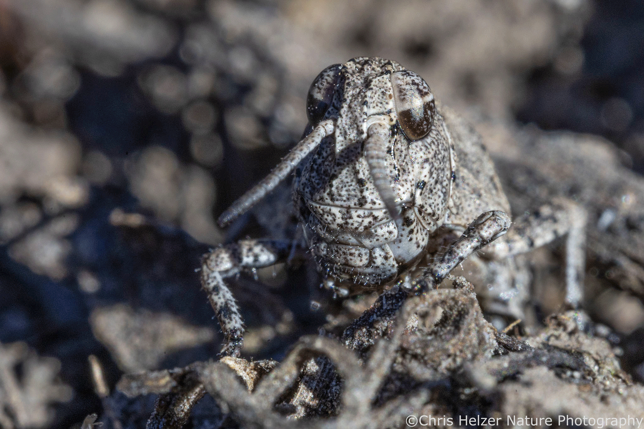 In fact, there were two or three little grasshopper nymphs within a foot or so of each other. I can’t tell you for sure whether there were two or three because they were incredibly hard to see – a combination of their diminutive size and their amazing camouflage. If I glanced away from one for just a second, I couldn’t find it again. Each nymph was about a half inch long and colored almost exactly like the dead grass around it, complete with dark mottling that helped blend with the shadows.
