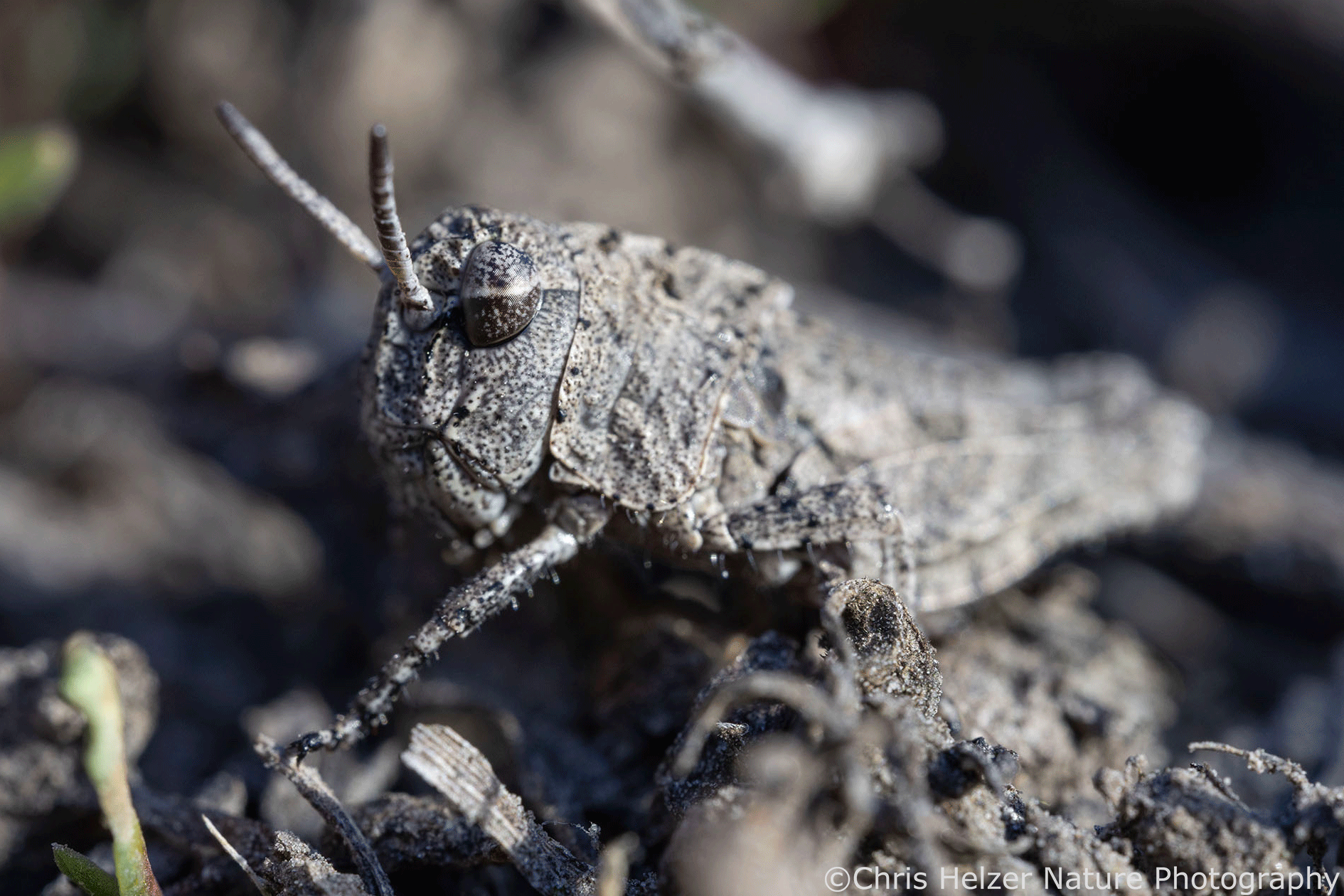 Once I headed to some of the more heavily-grazed areas from last season, though, and sat down to focus more closely, I started to find movement. I saw a couple little flies first. Then, I noticed something hop. I wasn’t sure it had been a hop, actually, because the stiff breeze kept picking up little bits of dried plant and tossing them in front of me as I walked. Several times, I thought I’d seen an insect move but, upon closer inspection, it was just a seed, part of a leaf, or something else. This time, though, the hop had been legitimate, and it had been performed, appropriately, by a tiny grasshopper.