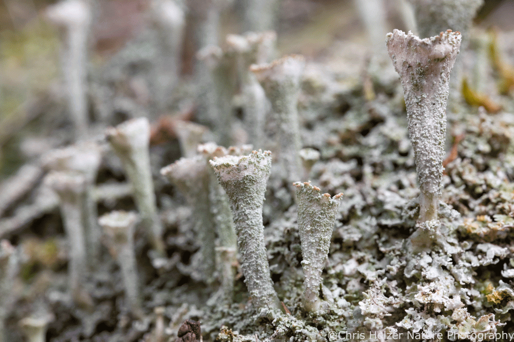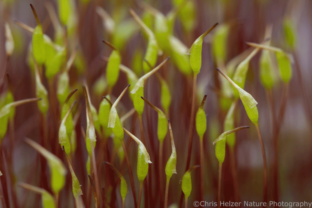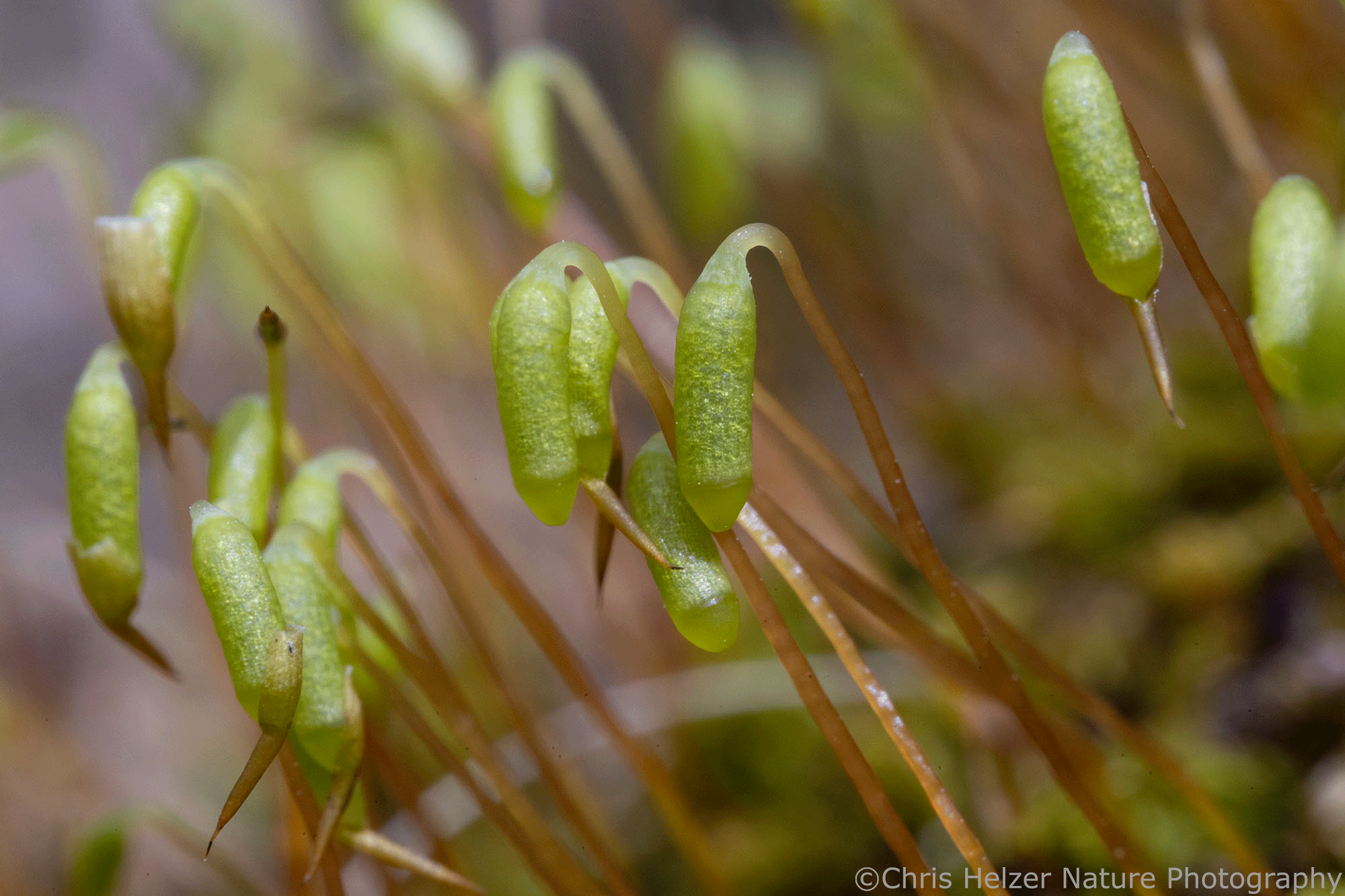 I didn’t see any flowers, per se, on the whole trip. However, I did find flower-like structures on a couple different species. There were at least a couple different mosses with sporophytes (fruiting bodies) growing in shady spots, both at the edge of the prairie/woodland border and down along a creek. In addition, some of the lichens in the woods were showing off their vase-like perithecia (I had to look that one up).