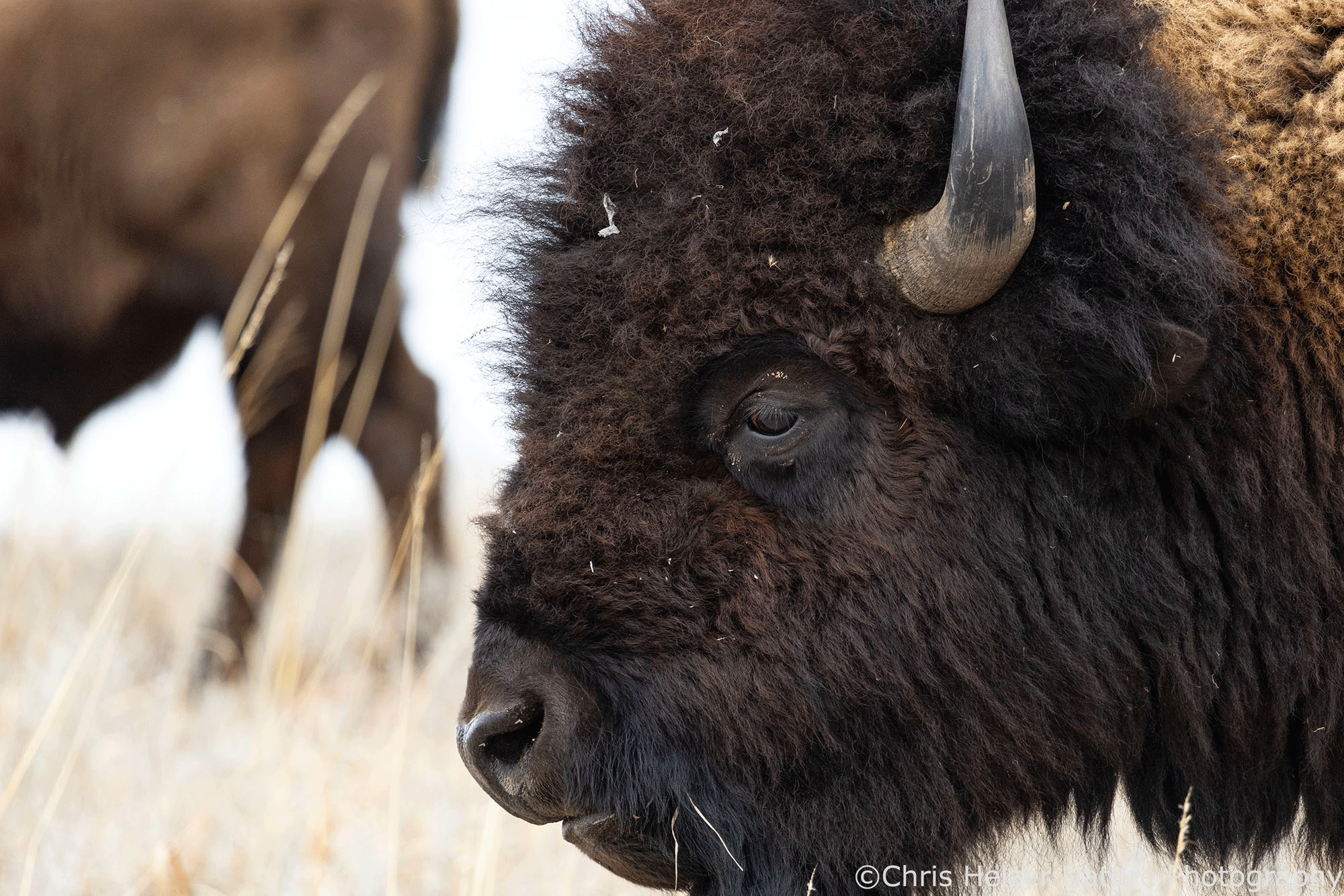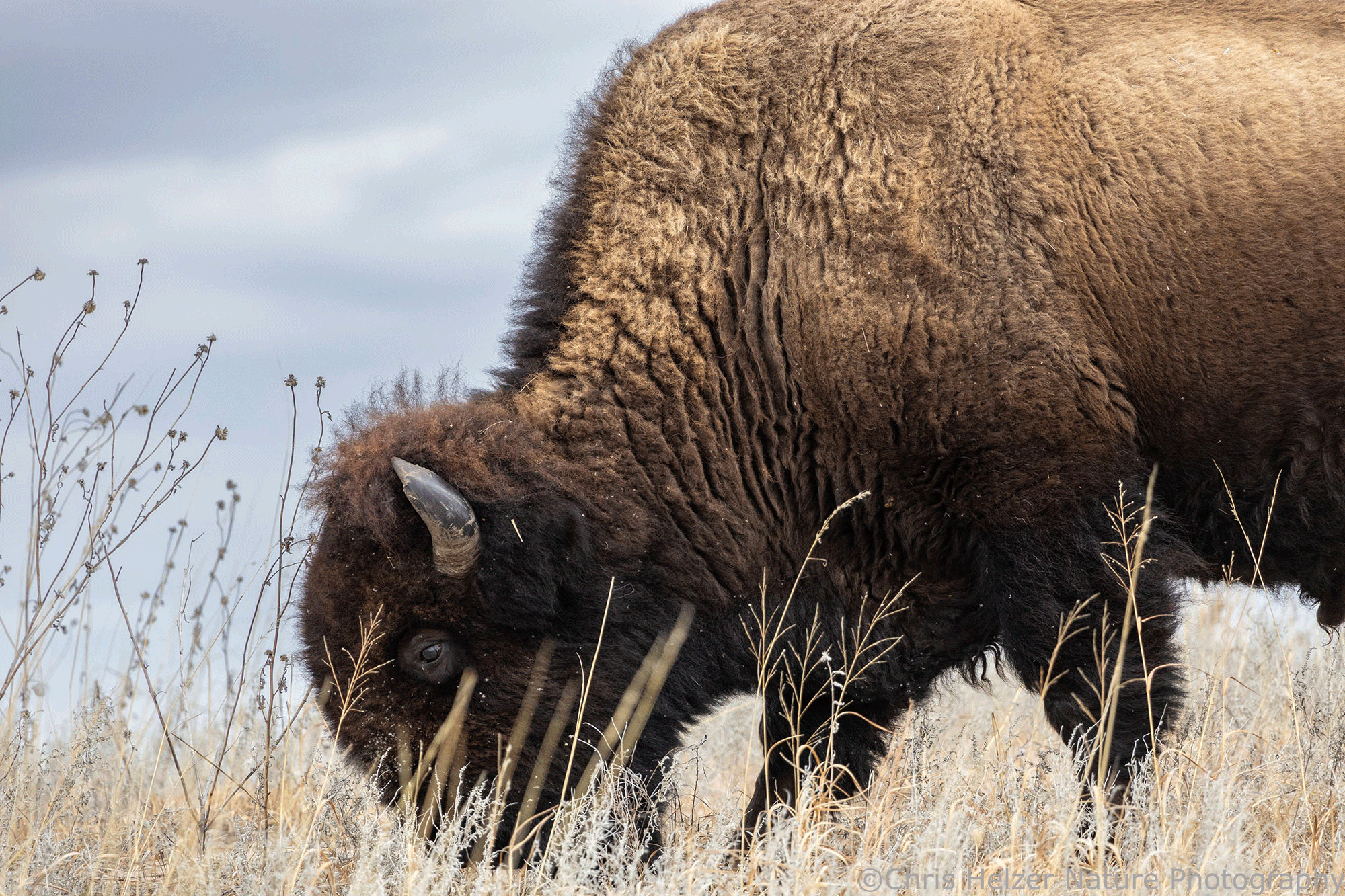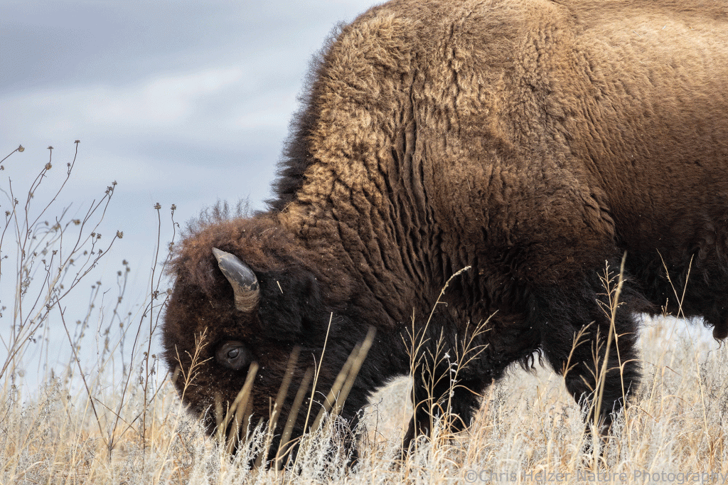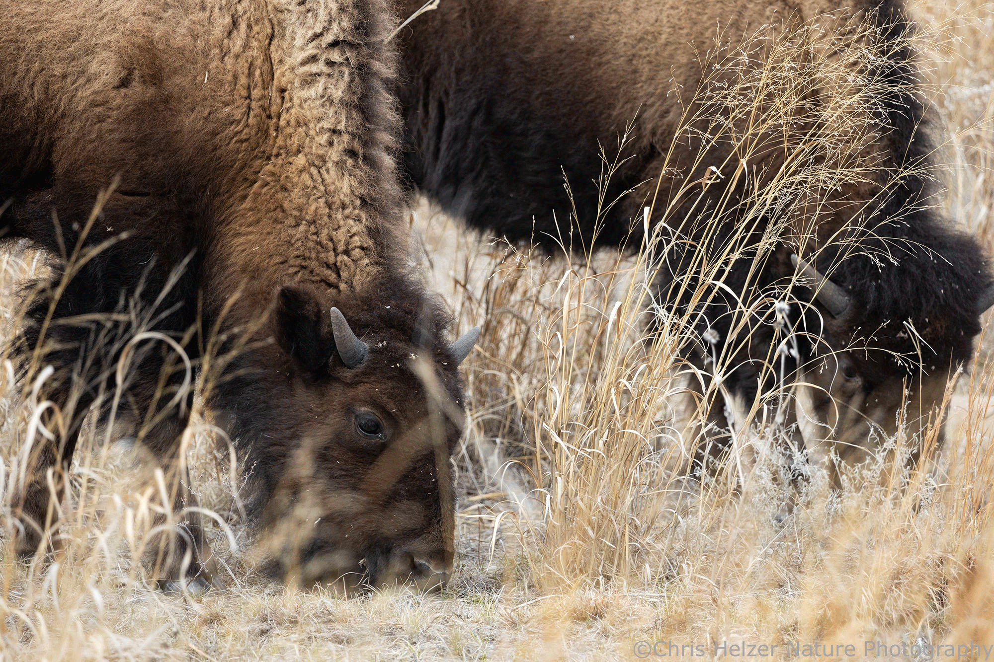 However, there was still plenty to see. I spent time with a small group of bison and watched them graze on the dormant vegetation from last season. Even after seeing this for many years, it still astounds me that these huge animals can fulfill their nutritional needs from dried-up plants. They’ve had millennia to hone their methods, of course, but still. Those are big animals and I don’t know if you’ve ever chewed on dried up grass but it doesn’t seem very satisfying.