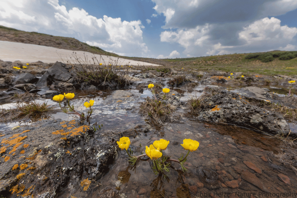 While Kim was running, I took this photo of buttercups growing in meltwater coming from the snow in the background.