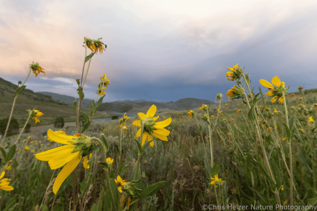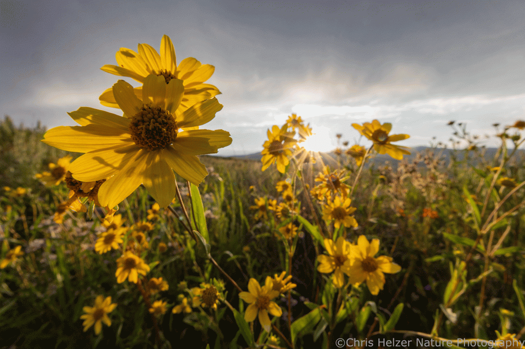Wildflowers (Bidens sp?) and the setting sun at Statecoach State Park