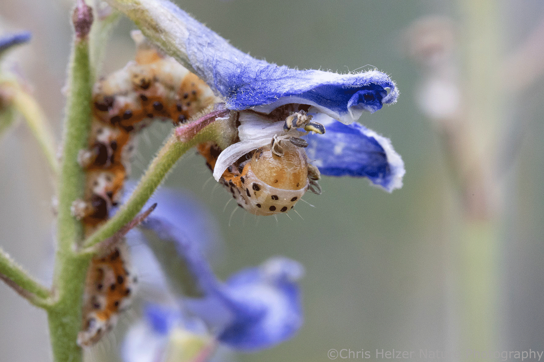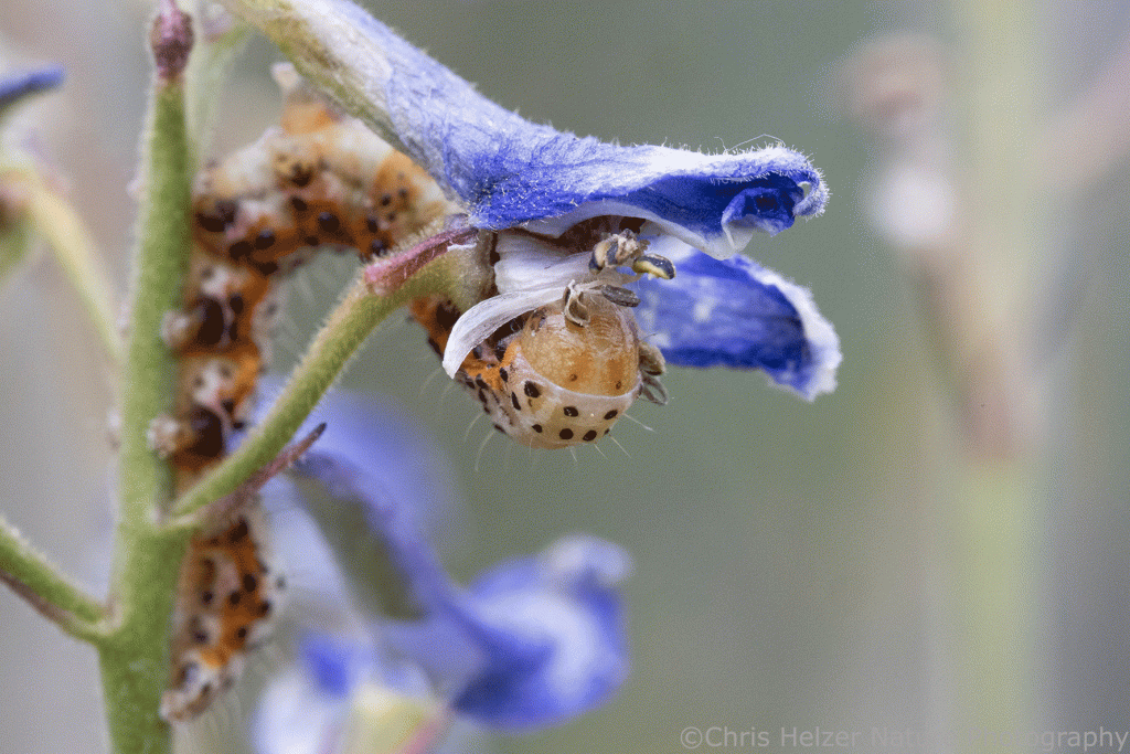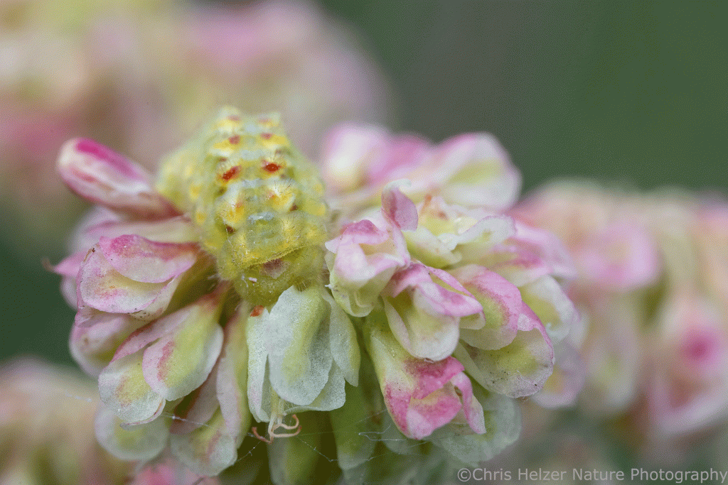 A caterpillar that was pretty well camouflaged on a buckwheat (Eriogonum sp) flower.