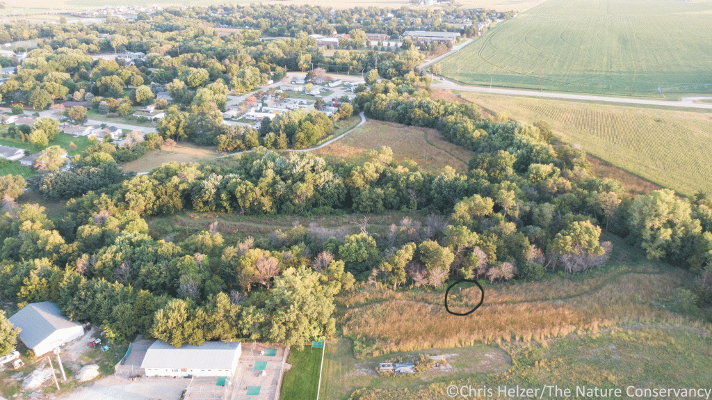 I wanted to start this post by showing you where this little square meter plot is located. Lincoln Creek Prairie is about 14 acres on the eastern edge of Aurora, Nebraska. The park is bordered by crop land, housing developments, the local adopt-a-pet facility, and the city waste site. My little plot (circled in black on the two aerial photos shown here) is in a small strip of restored prairie nestled between a line of trees and some mowed grass leading to the waste site. I walk past the barking dogs at the pet adoption center whenever I visit my plot.