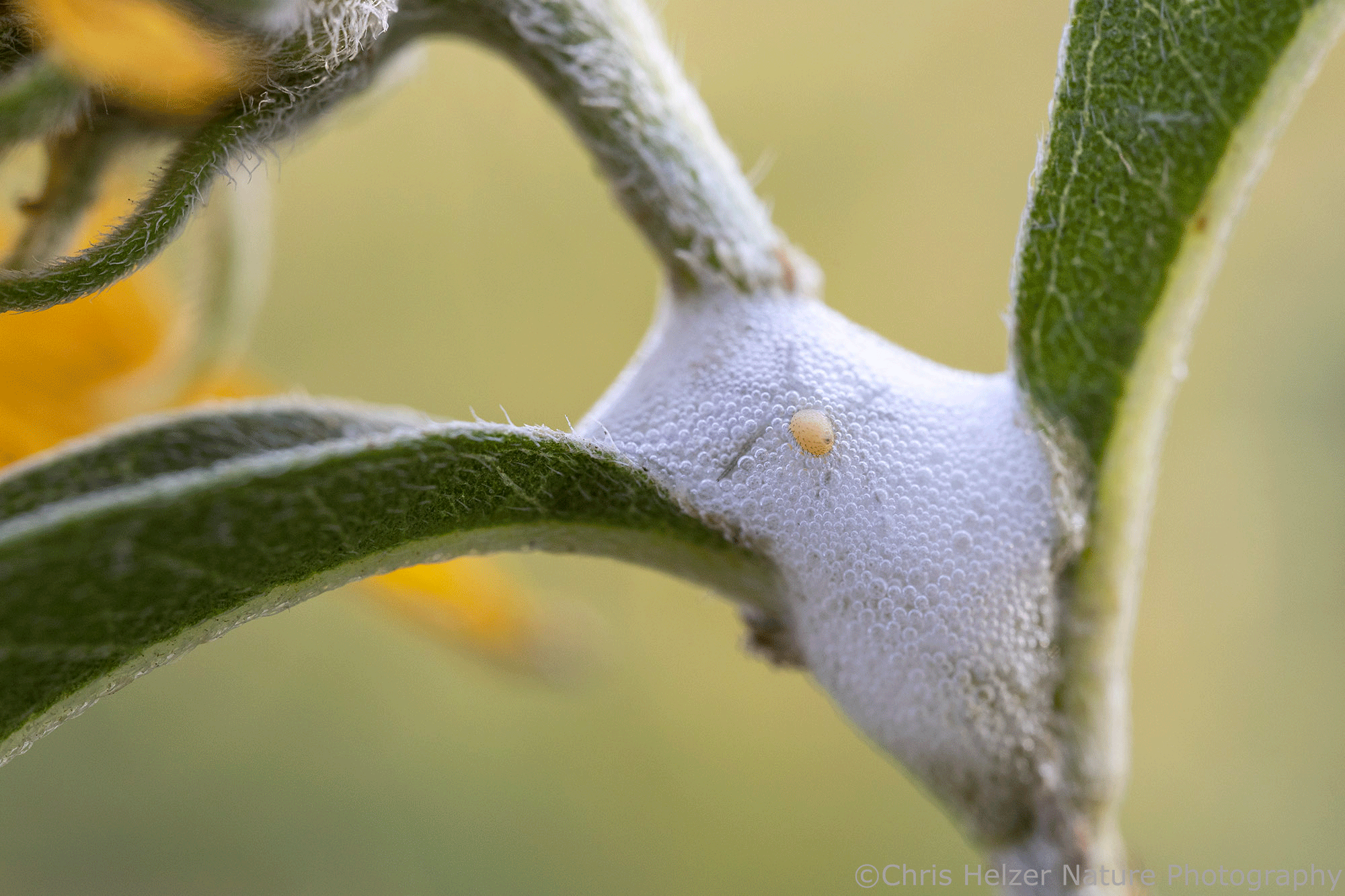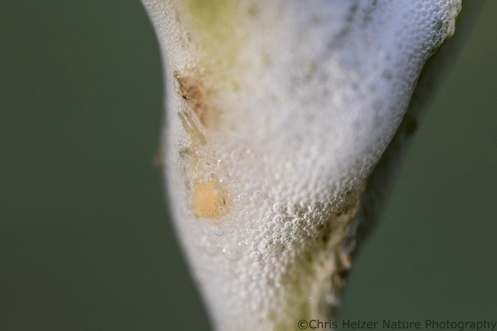 Here’s a photo (below) of one of the two larval habitats of spittle bugs I found this month. I showed the same cluster of bubbles in an earlier post, in which you could see two larvae within the froth. This time, if you look closely, you can see a circular object in the middle of the bubbles. I assumed when I took the photo that it was another spittle bug larva. That seems like a reasonable assumption, right?