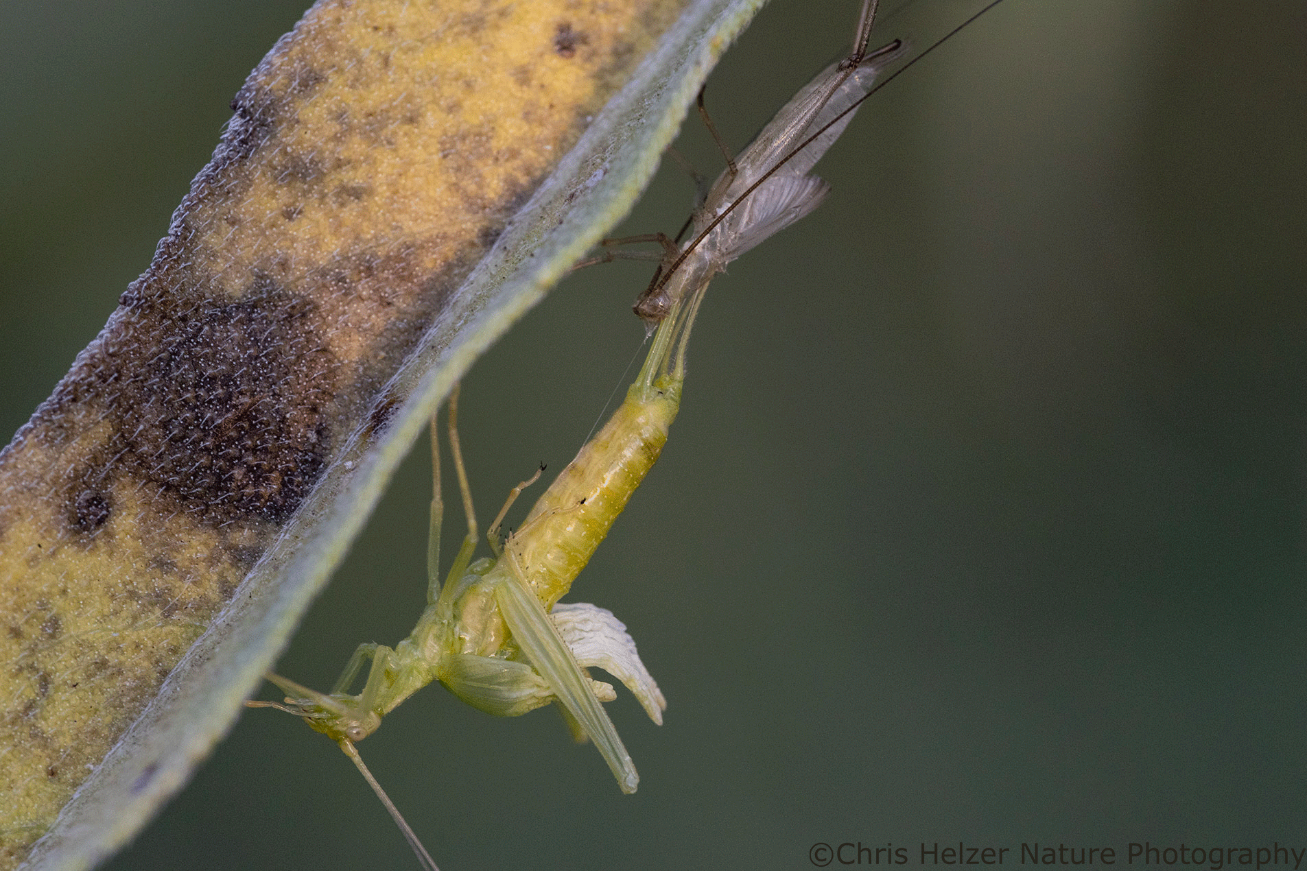 That time to focus came into play recently with a katydid. I saw my first katydid nymph back in late May, but then didn’t see another until late September, for some reason. Then, within a week, I saw two different species. They are both meadow katydids: the straight-lanced meadow katydid and the seemingly-contradictorily named woodland meadow katydid.