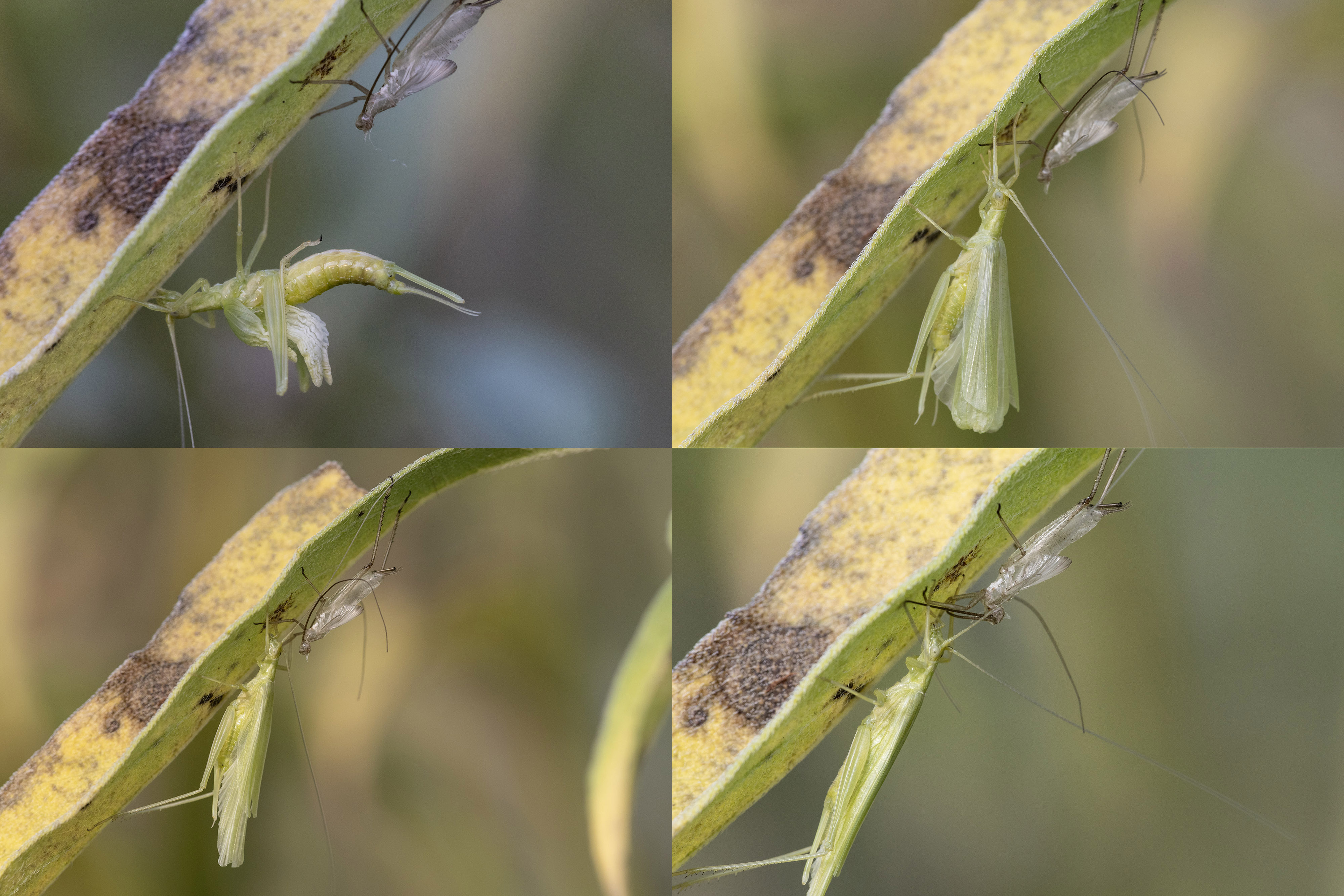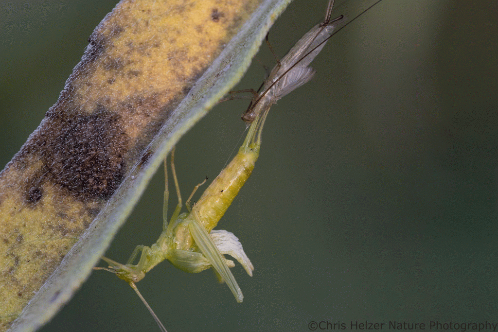 On September 15, I arrived at the plot to find a tree cricket pulling the last bit of its body out of its old exoskeleton. It was apparently completing its final molt into full adulthood. I’ve included the first photo I took of it, along with a series of others from the next hour and fifteen minutes or so. I’ve seen this kind of a thing many times, but I’m always amazed at how scrunched up the insects are before molting, and how well they expand and elongate after emerging.