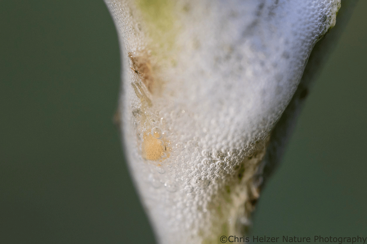 I don’t know, but some online searching reveals that it’s not an isolated case. Dead invertebrates have been found in spittle bug masses before. I couldn’t tell, though, whether there’s any consensus about what’s going on. Is it just the mass of bubbles doing their job to protect the larvae? Why would a predator crawl into something that will kill it? Is it surprised to find itself stuck? Does it suffocate as it would if sprayed with soapy water? So many questions. I’d love to hear if others have seen something like this.